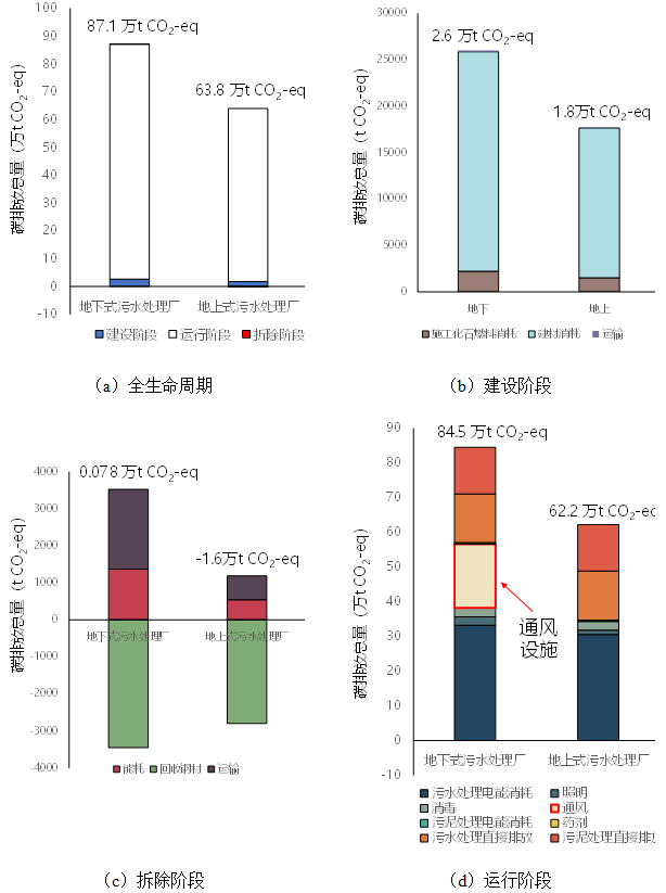 地下式污水处理厂产生的综合环境与投资影响(LCCI)较同等规模与工艺的地上式污水处理厂高出21%,全生命周期碳排放较地上式高出36.5%。即使地下厂地面部分留作绿地园林景观,所产生生态效益也无法抵消对环境产生的总的负面影响。