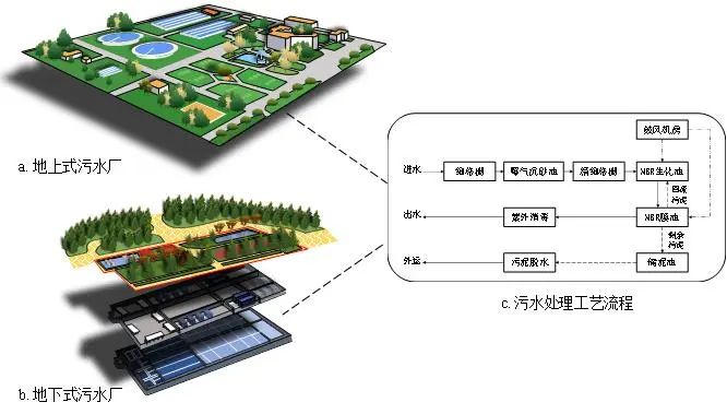 图1 地上厂(a)与地下厂(b)污水处理厂构造及其处理工艺流程(c)