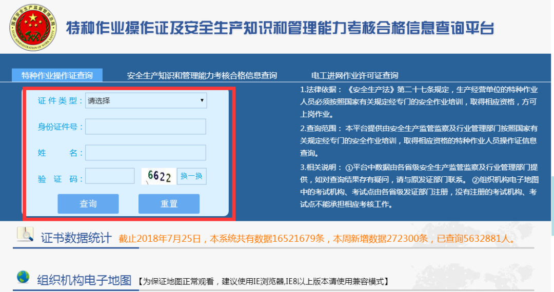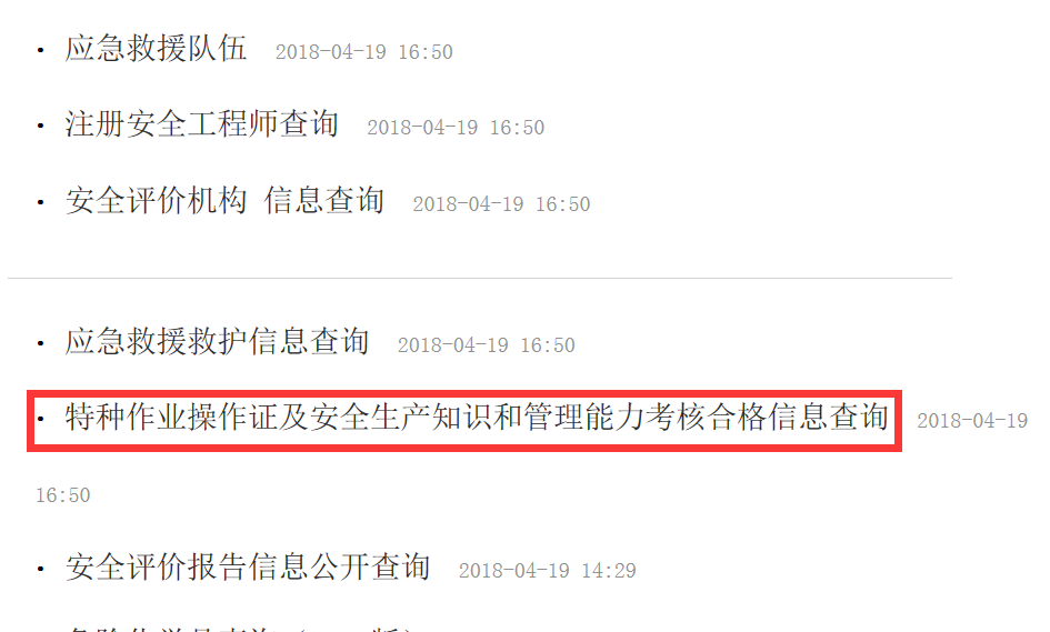 2、找到“特种作业操作证及安全生产知识和管理能力考核合格信息查询”,点击进入;