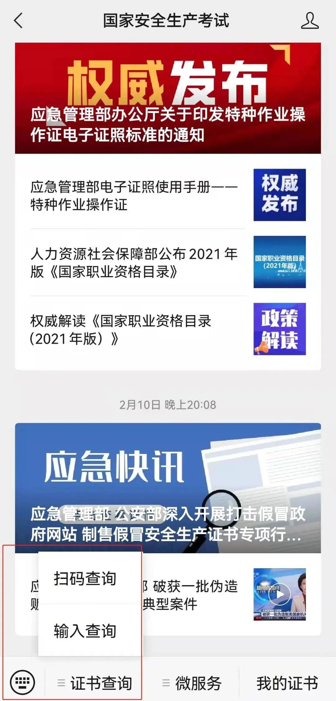 5、选择“证书查询”,新版二维码证件选择“扫码查询”,旧版证件选择“输入查询”;
