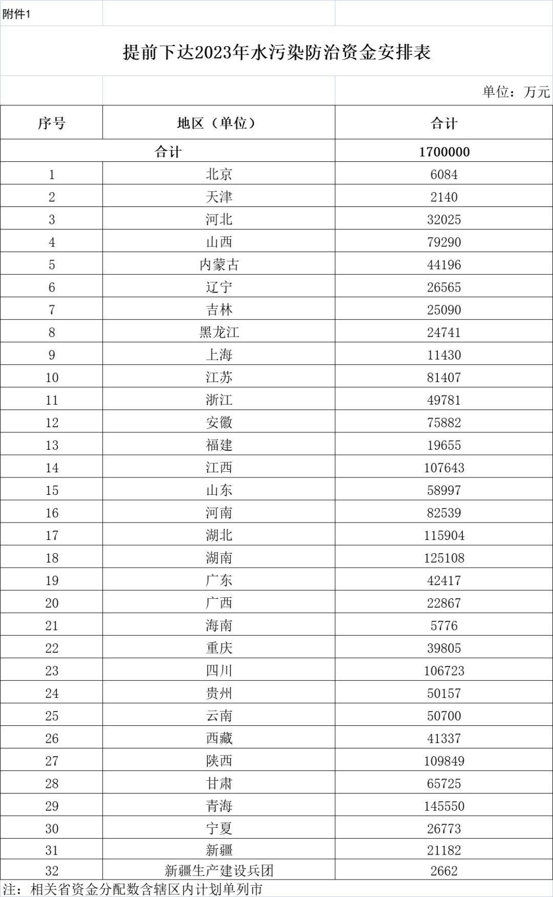为促进水环境质量改善,加快推进水污染防治工作,现提前下达你省(自治区、直辖市、新疆生产建设兵团,以下统称省)2023年水污染防治资金,用于支持水污染防治和水生态环境保护方面相关工作,并就有关事项通知如下: