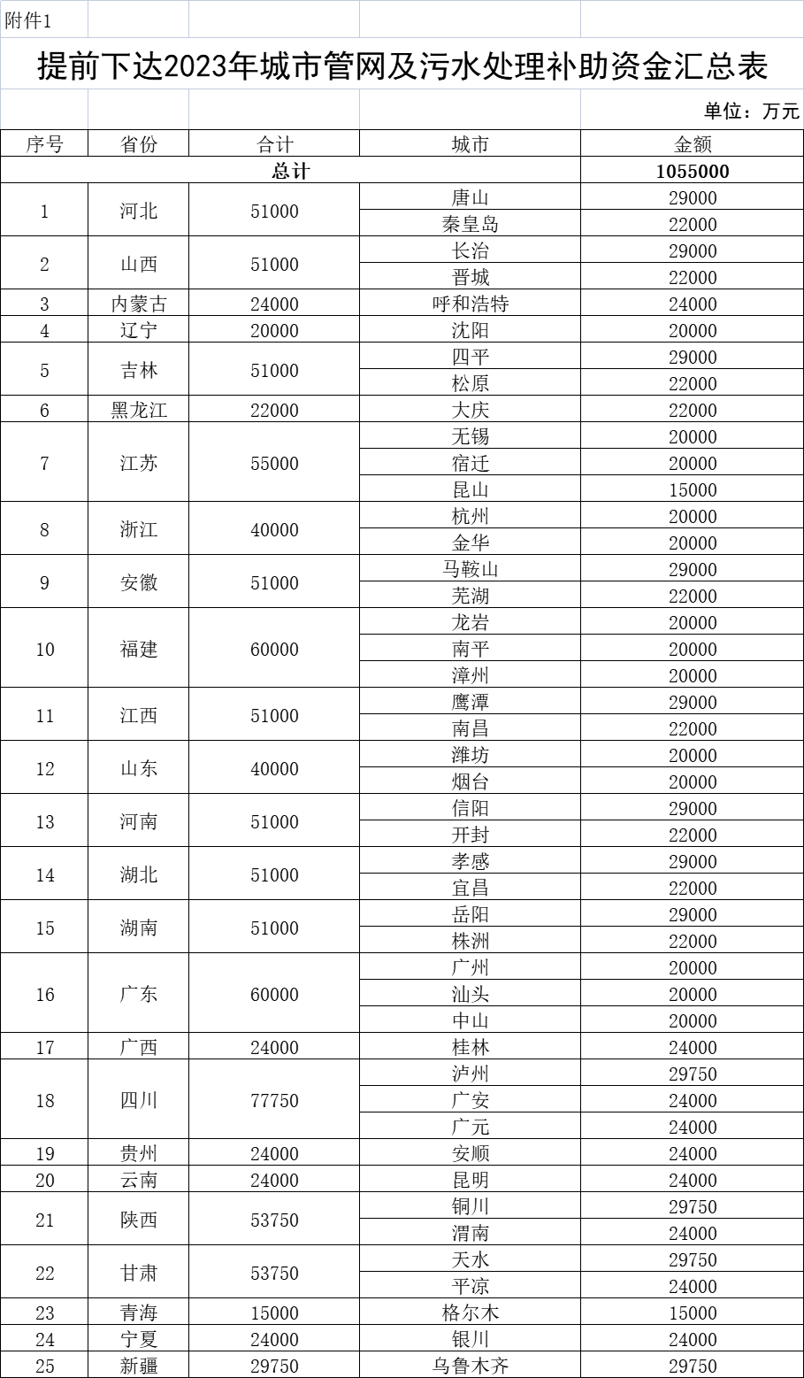 附件:1.提前下达2023年城市管网及污水处理补助资金汇总表