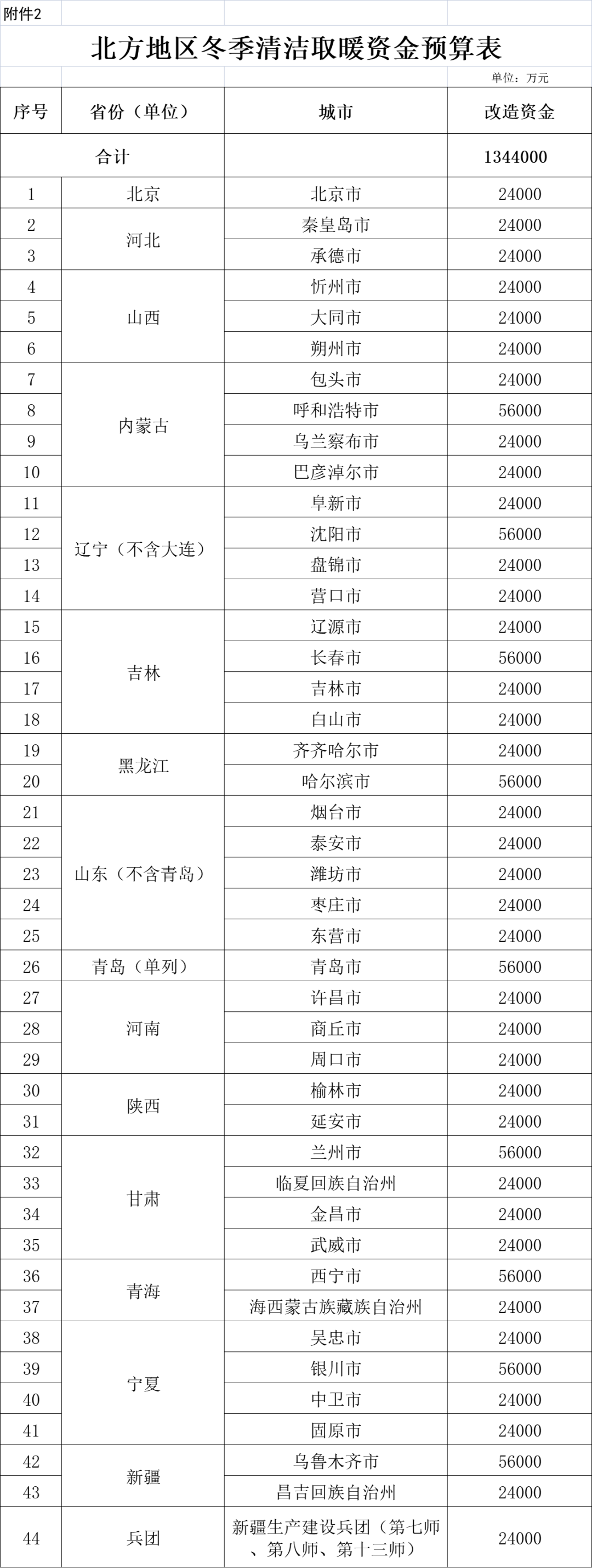 二、北方地区冬季清洁取暖资金额度详见附件2、3。请相关省抓紧拨付资金,会同有关部门督促相关城市积极稳妥地做好清洁取暖工作。