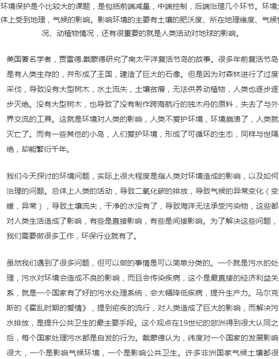 环境保护是个比较大的课题,是包括前端减量,中端控制,后端治理几个环节。环境大体上受到地理,气候的影响。影响环境的主要有土壤的肥沃度、所在地理维度、气候情况、动植物情况,还有很重要的就是人类活动对地球的影响。