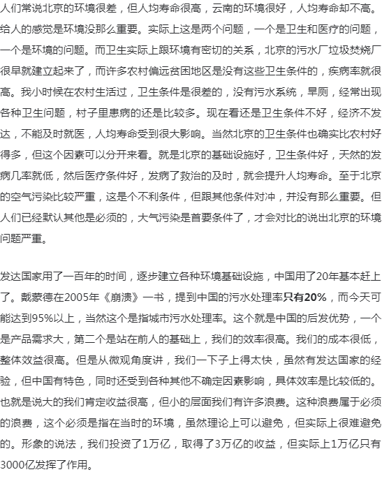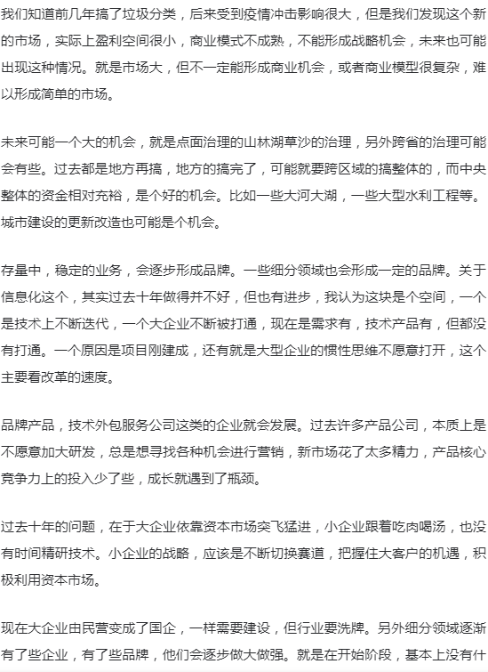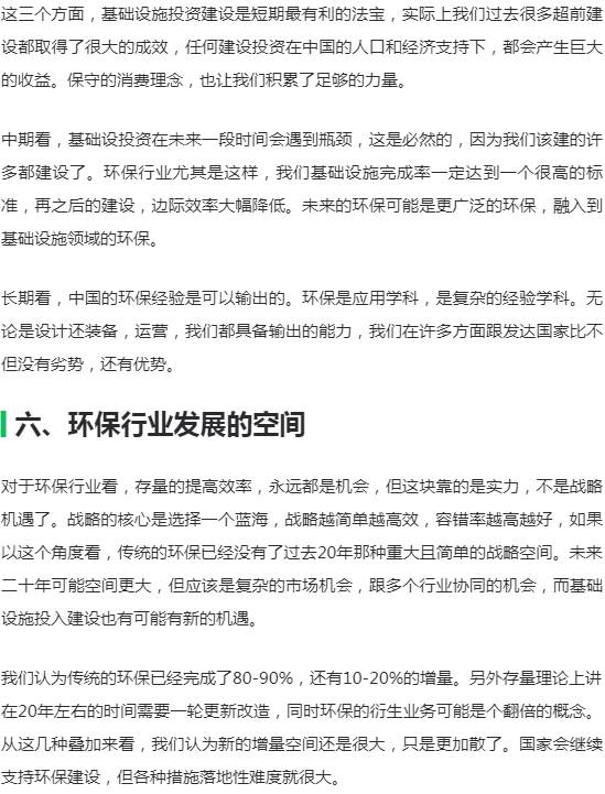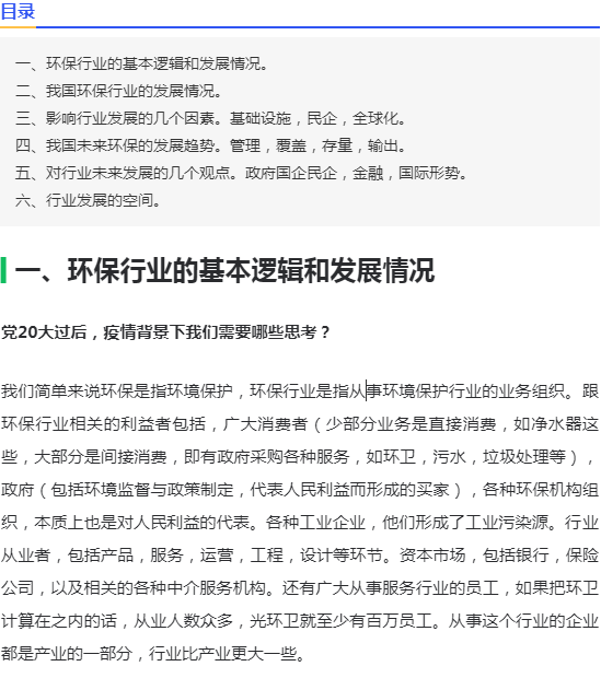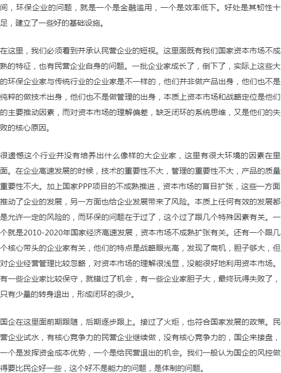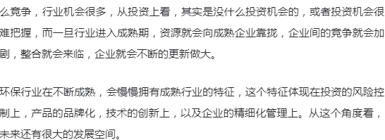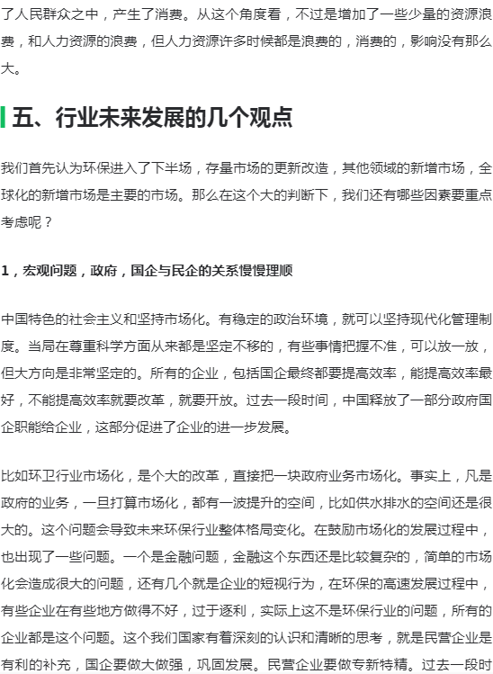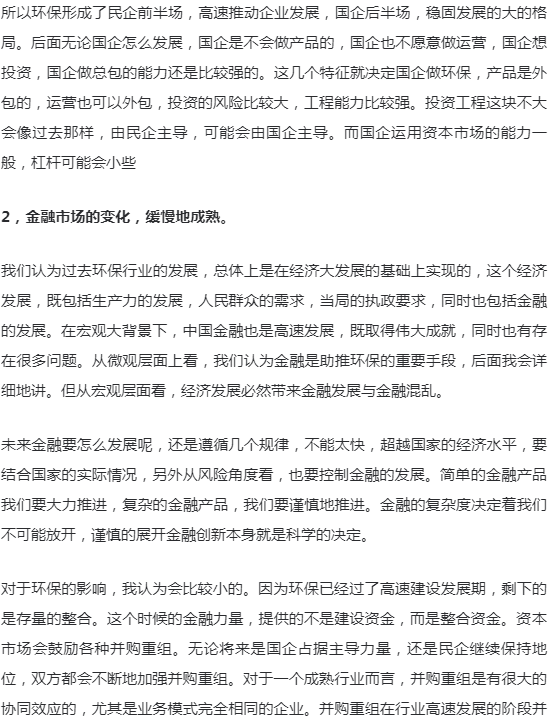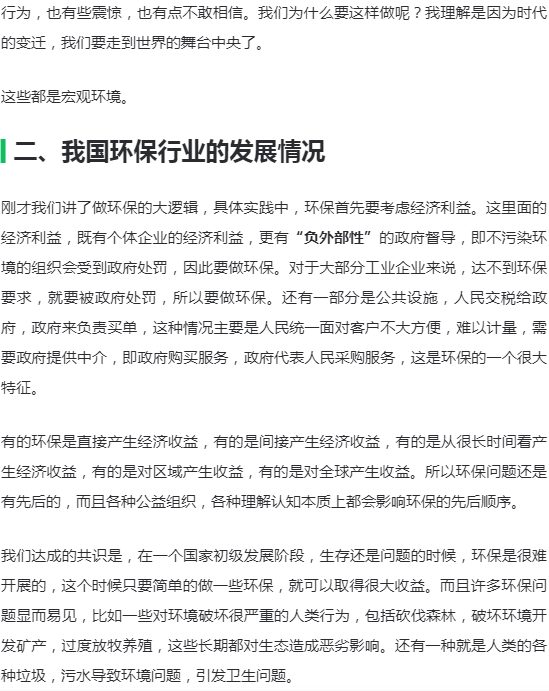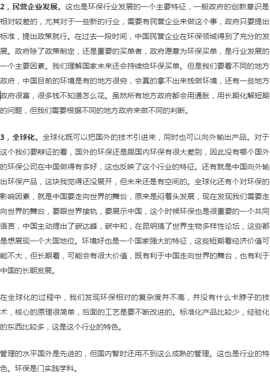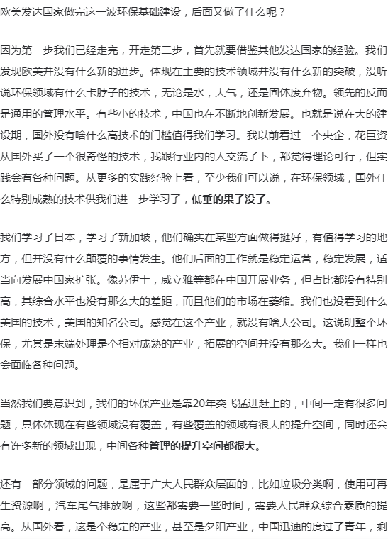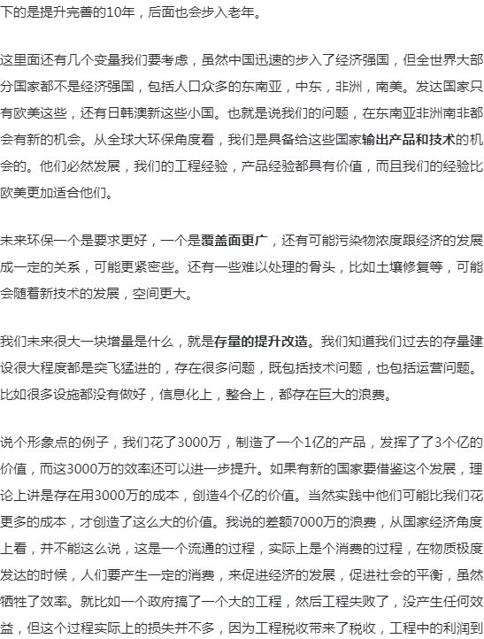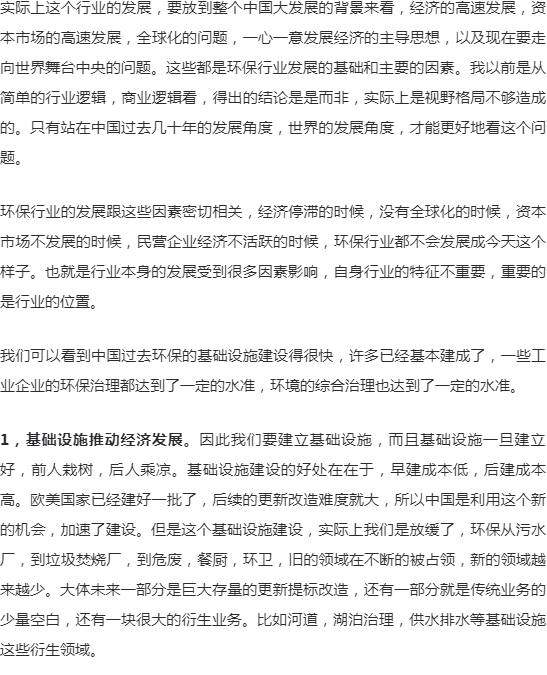 要研究环保行业的发展,如果只是研究行业逻辑、商业逻辑,得出的结论往往似是而非。环保行业的发展,要放到整个中国大发展的背景来看,经济的高速发展,资本市场的高速发展,全球化的问题,一心一意发展经济的主导思想,以及现在要走向世界舞台中央的问题。这些都是环保行业发展的基础和主要的因素。