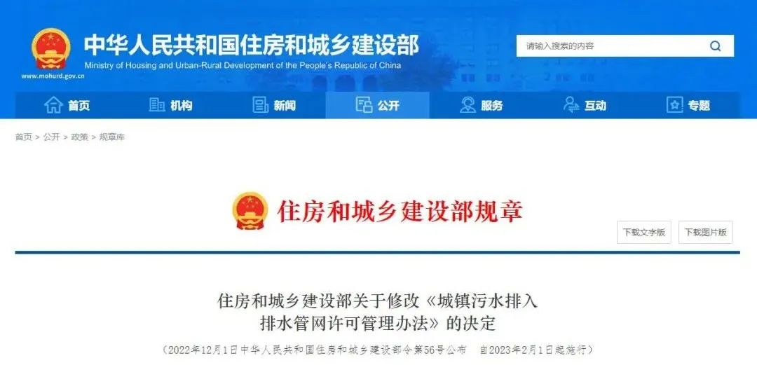 住房和城乡建设部关于修改《城镇污水排入排水管网许可管理办法》的决定