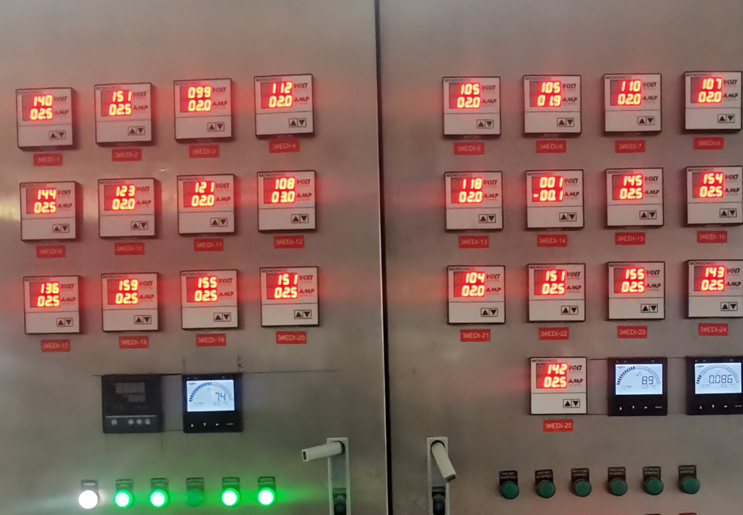 经过化学清洗后,EDI的水量明显恢复,单套浓水水量由污堵时的7.5m3/h(合300L/h/台)升至13m3/h/台(合520L/h/台),化学清洗完成后,EDI需要进行数小时的高电流(一般3-3.5A)再生过程,产水水质才可完全恢复。