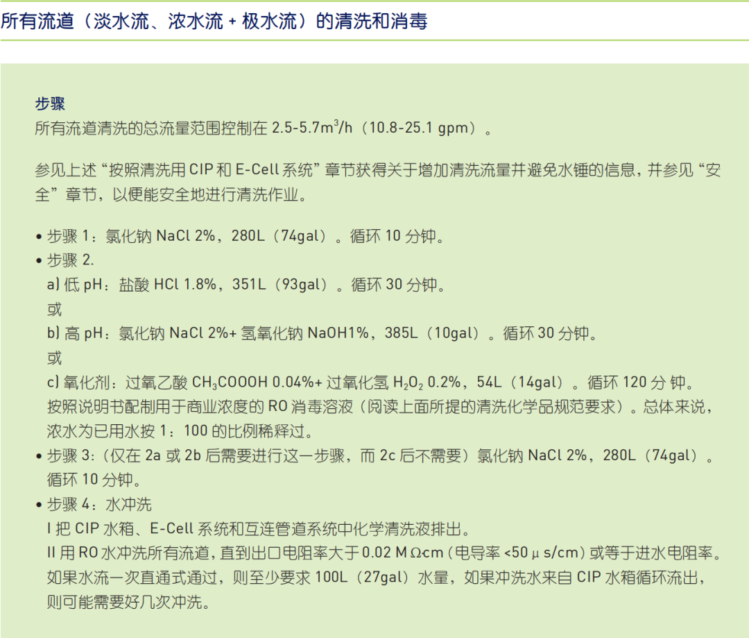 此种污染情况下,需要按照苏伊士原厂电子手册上的EDI清洗流程进行化学清洗。由于污染可能发生在不止一种水室,可以直接进行所有流道的化学清洗。