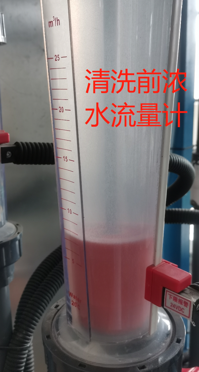 广东某大型印染污水处理厂,项目原水为印染废水,工艺流程为生化处理+多介质+超滤+双级反渗透+EDI,EDI装置一共5套,每套25台单台产水量为5m3/h的E-CELL-3X, 总EDI产水量为500m3/h。该设备于2021年初开始投入使用,使用半年多后,该4套设备均出现一定程度的产水量下降情况,并且EDI浓水量均下降到风险值,虽然该设备产水水质电阻率依旧稳定在16兆欧。但是担心过低的流量会对模块造成损伤,于是由我司上海望宇环境对该厂EDI设备进行勘察和清洗指导。