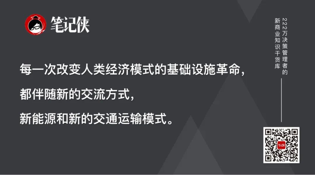 每一次改变人类经济模式的基础设施革命。都有一个共同点:它们都伴随新的交流方式,新能源和新的交通运输模式。