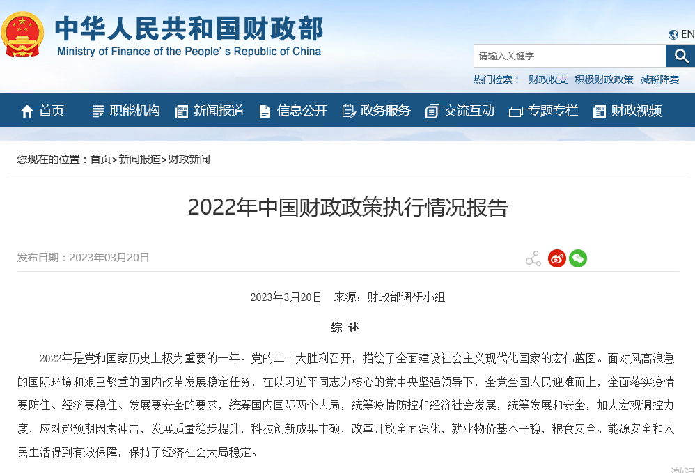 在党中央集中统一领导下,财政部门深入贯彻党的二十大精神,按照党中央、国务院决策部署,坚持稳中求进工作总基调,完整、准确、全面贯彻新发展理念,加快构建新发展格局,扎实推进稳经济一揽子政策和接续措施落地见效,积极的财政政策提升效能,更加注重精准、可持续。预算执行中,财政部门主动作为、应变克难,加强经济形势和财政收支分析研判,强化财政资源统筹,全年全国预算执行情况和经济发展状况基本匹配,为高效统筹疫情防控和经济社会发展提供了必要的财力支撑。