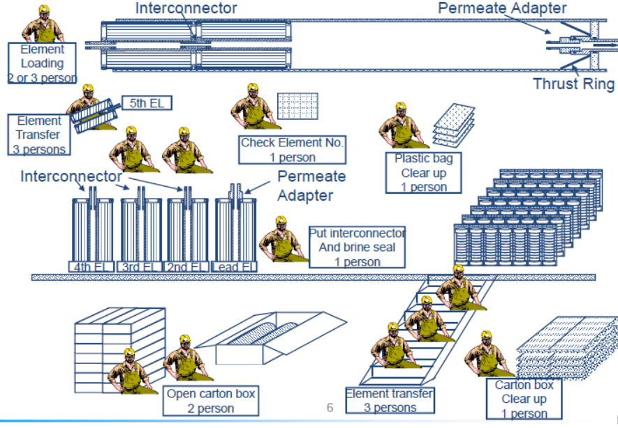 (图片来源网络)压力容器的准备工作:清洁压力容器内壁;安装反渗透膜元件之前,请清理压力容器内壁;去除可能导致膜元件污堵,或者刮损的固体颗粒,灰尘等;利用抹布或者海绵清理压力容器;注意: 清理压力容器内壁时,不要把内壁刮坏;水质分析:膜元件安装前一定要检测进水水质,所有的检测结果必须满足质保条款中的进水要求。膜元件安装前的准备工作:- 膜元件安装前必须完成所有的准备工作,并且环境干净整洁。- 准备干净的地方放置中心管,端板等物品。- 准备好安全物品(手套、护目镜、安全鞋等)。- 检查O型圈,中心管的数量。- 膜元件安装需要有序地进行,安装人员需要熟悉整个工作流程。- 每个安装人员需要了解其所负责的工作内容。- 保证安装过程中周围环境的干净整洁。垫片的作用:系统开机启动、关机时垫片可以减少膜元件在膜壳内部的前后运动;减少型圈与膜壳内部的摩擦。
