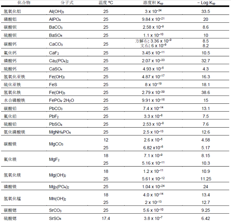 RO/NF 系统中,常见的难溶盐为CaSO4、CaCO3和SiO2,其它可能会产生结垢的化合物为CaF2、BaSO4、SrSO4和Ca3(PO4)2,下表列举了难溶无机盐的溶度积数据。