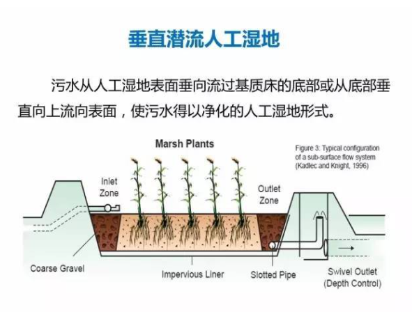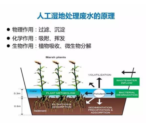 人工湿地是由人工建造和控制运行的与沼泽地类似的地面,将污水、污泥有控制的投配到经人工建造的湿地上,污水与污泥在沿一定方向流动的过程中,主要利用土壤、人工介质、植物、微生物的物理、化学、生物三重协同作用,对污水、污泥进行处理的一种技术。其作用机理包括吸附、滞留、过滤、氧化还原、沉淀、微生物分解、转化、植物遮蔽、残留物积累、蒸腾水分和养分吸收及各类动物的作用。