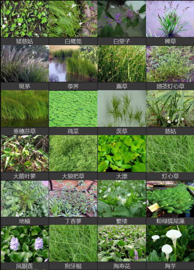 湿地植物植物具有很强的生命力和旺盛的生长势抗冻、抗热能力由于污水处理系统是全年连续运行的,故要求水生植物即使在恶劣的环境下也能基本正常生长,而那些对自然条件适应性较差或不能适应的植物都将直接影响净化效果。抗病虫害能力污水生态处理系统中的植物易滋生病虫害,抗病虫害能力直接关系到植物自身的生长与生存,也直接影响其在处理系统中的净化效果。对周围环境的适应能力由于人工湿地中的植物根系要长期浸泡在水中和接触浓度较高且变化较大的污染物,因此所选用的水生植物除了耐污能力要强外,对当地的气候条件、土壤条件和周围的动植物环境都要有很好的适应能力。所引种的植物必须具有较强的耐污染能力水生植物对污水中的BOD5、COD、TN、TP主要是靠附着生长在根区表面及附近的微生物去除的,因此应选择根系比较发达,对污水承受能力强的水生植物。植物的年生长期长,最好是冬季半枯萎或常绿植物;人工湿地处理系统中常会出现因冬季植物枯萎死亡或生长休眠而导致功能下降的现象,因此,应着重选用常绿冬季生长旺盛的水生植物类型。所选择的植物将不对当地的生态环境构成隐患或威胁,具有生态安全性;具有一定的经济效益、文化价值、景观效益和综合利用价值。若所处理的污水不含有毒、有害成分,其综合利用可从以下几个方面考虑:①作饲料,一般选择粗蛋白的含量>20%(干重)的水生植物;②作肥料,应考虑植物体含肥料有效成分较高,易分解;③生产沼气,应考虑发酵、产气植物的碳氮比,一般选用植物体的碳氮比为25~30.5/1;④工业或手工业原料,如芦苇可以用来造纸,水葱、灯心草、香蒲、莞草等都是编制草席的原料。由于城镇污水的处理系统一般都靠近城郊,同时面积较大,故美化景观也是必须考虑的。然而在实际工作中,很多人工湿地的工艺设计者和建设者考虑得最多的是植物的独有性和观赏价值等表在因素,没有考虑到栽种该植物后的植株生长效果、湿地的运行效果、生长表现以及对生态的安全性等,导致人工湿地在运行一段时间后功能骤降或运行费用剧增,最后导致系统瘫费或闲置。漂浮植物漂浮植物中常用作人工湿地系统处理的有水葫芦、大薸、水芹菜、李氏禾、浮萍、水蕹菜、豆瓣菜等。