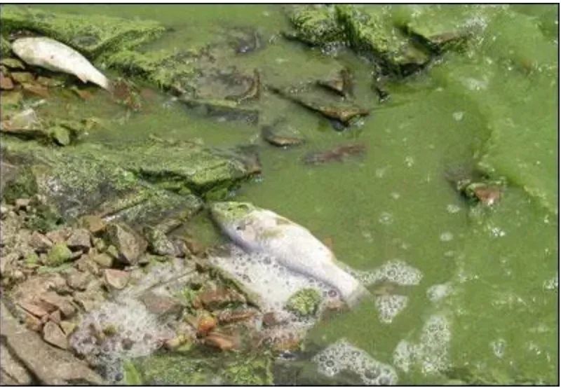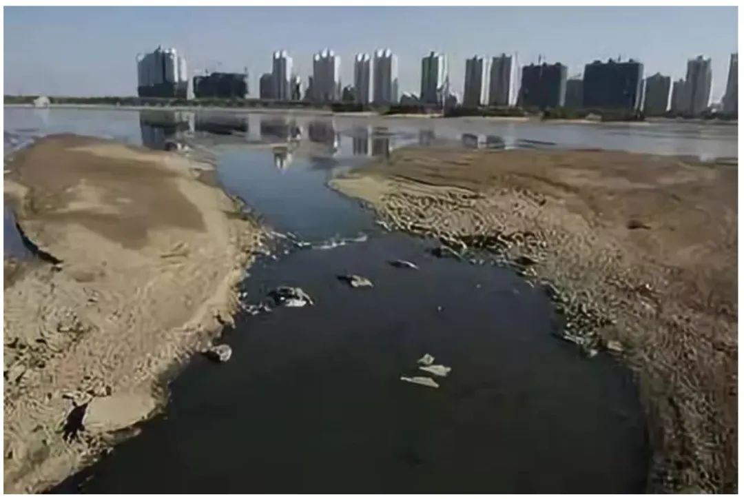 图2 黑臭水体(图片来自网络)以昆明滇池为例,尽管实施100%城市污水处理率、普及无磷洗衣粉、退耕还林等点源和面源的多重、多金控制,其水质仍不见好转。究其原因,很可能是流域内磷矿开采所导致的含磷径流进入滇池。欧洲经验表明,地面水体磷含量中约有10%来自于雨水对岩石的侵蚀作用,且水体富营养化国际标准也表明,在适宜条件下,单就非点源径流污染就足以导致富营养化。对滇池而言,流经磷矿开采后裸露地面的径流中的磷含量不言而喻。