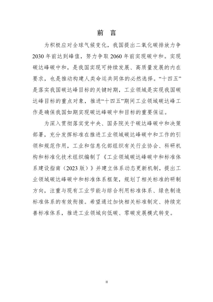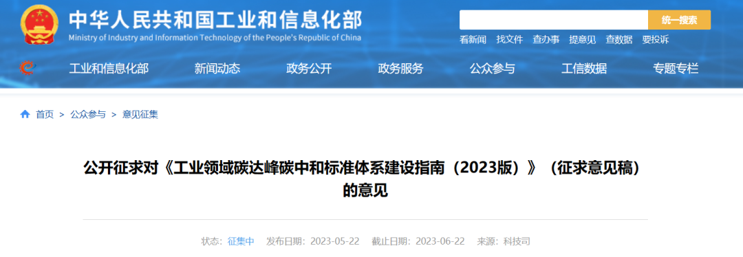 公开征求对《工业领域碳达峰碳中和标准体系建设指(2023版)》(征求意见稿)的意见为充分发挥标准在推进工业领域碳达峰碳中和工作中的支撑和引领作用,我们组织编制完成了《工业领域碳达峰碳中和标准体系建设指南(2023版)》(征求意见稿)(见附件1)。现公开征求社会各界意见,如有意见或建议,请填写《征求意见反馈信息表》(见附件2)发送至 KJBZ@miit.gov.cn (邮件主题注明:工业领域碳达峰碳中和标准体系建设指南征求意见反馈)。公示时间:2023年5月22日-2023年6月22日联系电话:010-68205261附件:1.《工业领域碳达峰碳中和标准体系建设指南(2023版)》(征求意见稿).docx 下载 2.征求意见反馈信息表.doc 下载工业和信息化部科技司2023年5月22日