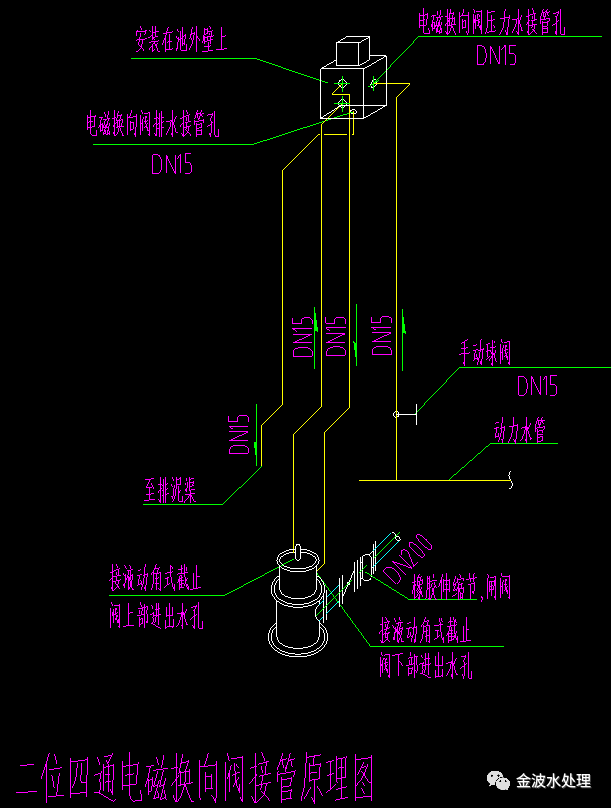 上图为安装成品图一。设备选型,优点排泥阀系统既可以采用液动控制,也可以选择气动控制,驱动原理相同,唯一不同处在于管道上,如果采用液动控制系统需要使用(铝塑管.UPVC)进行施工,如果采用空气驱动,需采用不锈钢管进行丝扣连接。液控系统只需要有5公斤压力自来水进行驱动既可运行,气控系统需要有一套空气压缩机进行4-5公斤稳定气源供气进行驱动运行。排泥阀系统最为关键部位为二位四通电磁换向阀(简称电磁阀),及角式隔膜快开排泥阀(简称排泥阀)。1.电磁阀讲解,电磁阀必须选用YC24D-DN15系列专用型号,排泥阀开关全部由电磁阀进行切换控制。所以电磁阀质量的好坏,决定了排泥阀能否有效的进行开关排泥。电磁阀为通用阀门,既可以用在液动控制系统,也可以用在气动控制系统。比如水厂,污水厂,石油,造纸,冶金。必须选择图2照片上这种专用电磁阀,此款专用电磁阀可以在条件恶劣的工作场所进行稳定运行。2排泥阀必须采用JM744型号图2照片上专用阀门才能电磁阀配套使用。二。运行原理以上选型配套设备可以就地控制也可以进行远程自动化进行排泥,动力水(气源)经过电磁换向阀(p为进水口O为排水口A为开阀B为关阀)进行控制快速打开角式隔膜快开排泥阀(上缸为关,下缸为开),将池底泥沙及污物实现快速排泥。三。故障及维修一。电磁阀故障如下,1.电磁阀不动作,2.电磁线圈进水损坏,3.电流过大损坏电磁线圈。4.电磁阀滑套卡住。 电磁阀维修如下,1.电磁阀不动作首先检查是否通电,2如果电磁阀通电检查是否线圈进水以及电流过大导致线圈损坏,如果损坏只有更换新的电磁阀,因为维修成本等同于买新的电磁阀价格。2.电磁阀卡住可以拆开阀缸滑套检查是否油孔堵塞,润滑油不足,如果堵塞用小钢丝进行堵孔清理,如果缺少润滑油需要进行加油保证良好的润滑,就不容易发生卡住事故。 二。排泥阀故障如下,1.无法打开,2.无法关闭。3.关闭不严。 排泥阀维修如下,1.如果排泥阀门无法打开,首先检查动力水(气源)有没有到达开阀接口,如没有则是管道或者电磁阀问题,如果到达接口则需要检查下腔橡胶隔膜是否损坏漏水。2.如果排泥阀门无法关闭同打开原理一样进行检查。3.关闭不严时需要检查动力水源(动力气源)是否满足工作压力,如果满足检查一下是否有污物顶到阀板导致关闭不严。