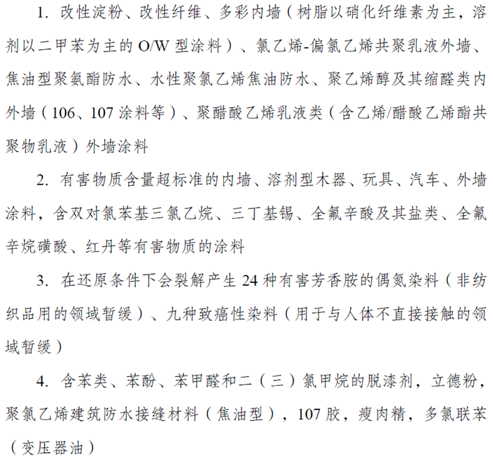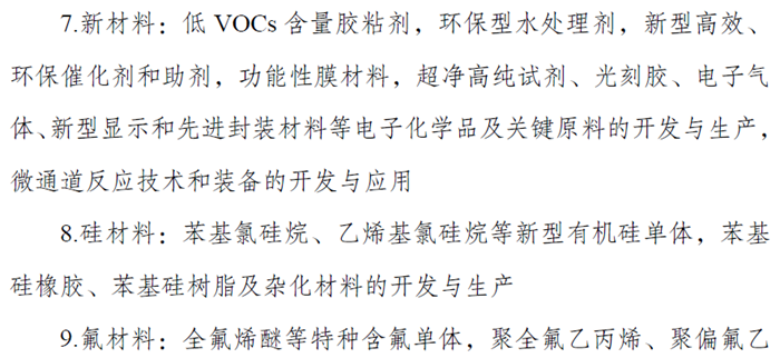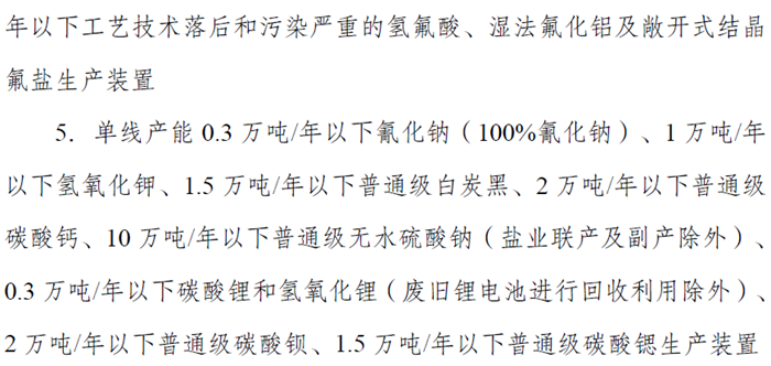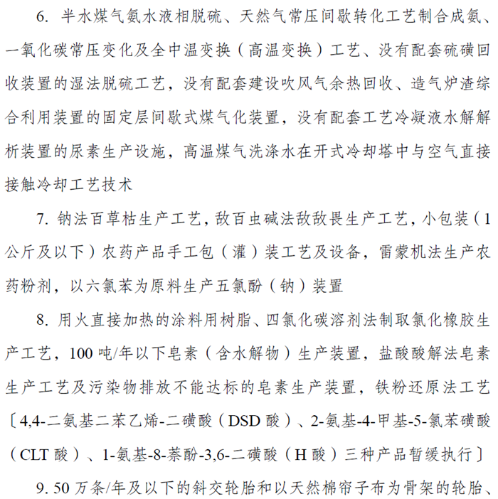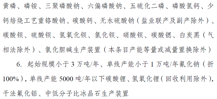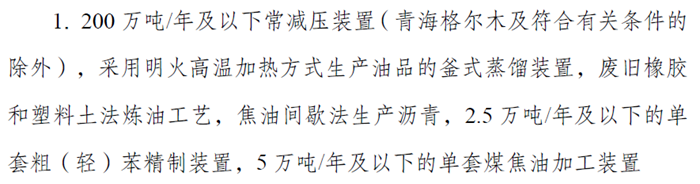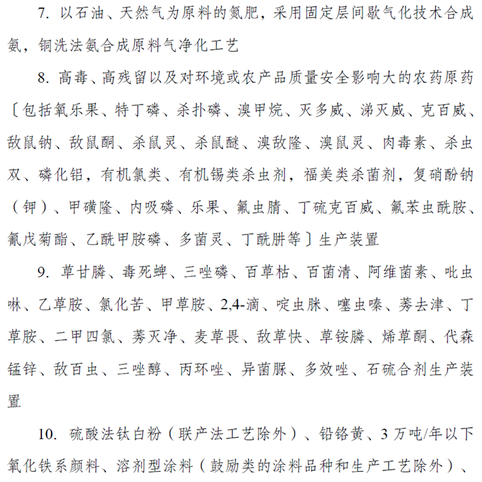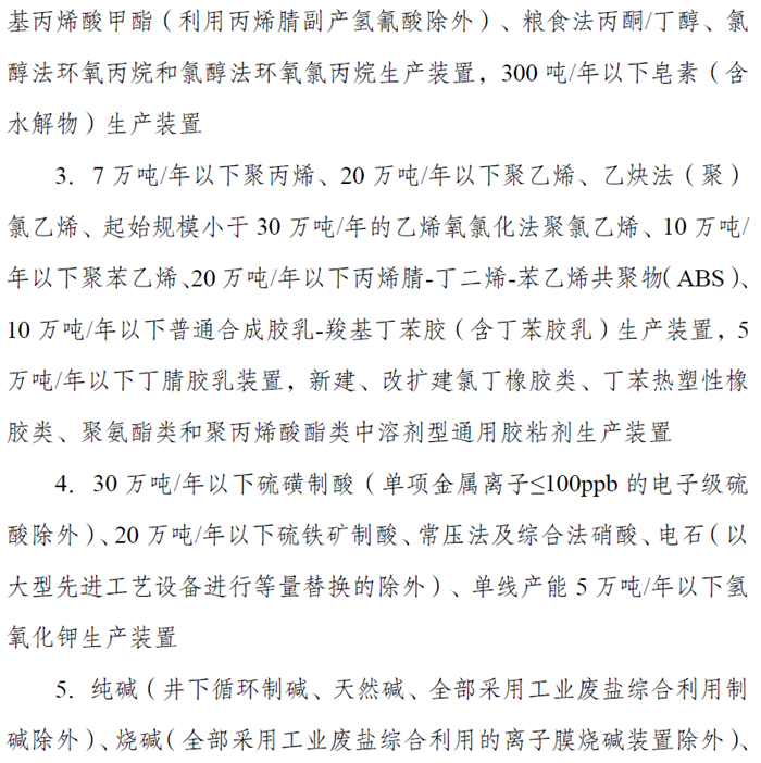 限制类石化化工行业限制类有13大类,意见稿内容对目录(2019年本)内容做出部分调整。调整内容包括:普通合成胶乳-羧基丁苯胶(含丁苯胶乳)生产装置由3万吨/年以下调整至10万吨/年以下;氧化铁系颜料1万吨/年以下调整至3万吨/年以下;钢丝帘线由3万吨/年以下调整至5万吨/年以下等。新增内容包括:甲草胺、2,4-滴、啶虫脒、噻虫嗪、莠去津、丁草胺、二甲四氯、莠灭净、麦草畏、敌草快、草铵膦、烯草酮、代森锰锌、敌百虫、三唑醇、丙环唑、异菌脲、多效唑、石硫合剂生产装置;VOCs含量超75%的硝基纤维素涂料生产装置;用作制冷剂、发泡剂等受控用途的二氟甲烷(HFC-32)、1,1,1,2-四氟乙烷(HFC-134a)、五氟乙烷(HFC-125)、1,1,1-三氟乙烷(HFC-143a)、1,1,1,3,3-五氟丙烷(HFC-245fa)生产装置(不含副产设施)等。