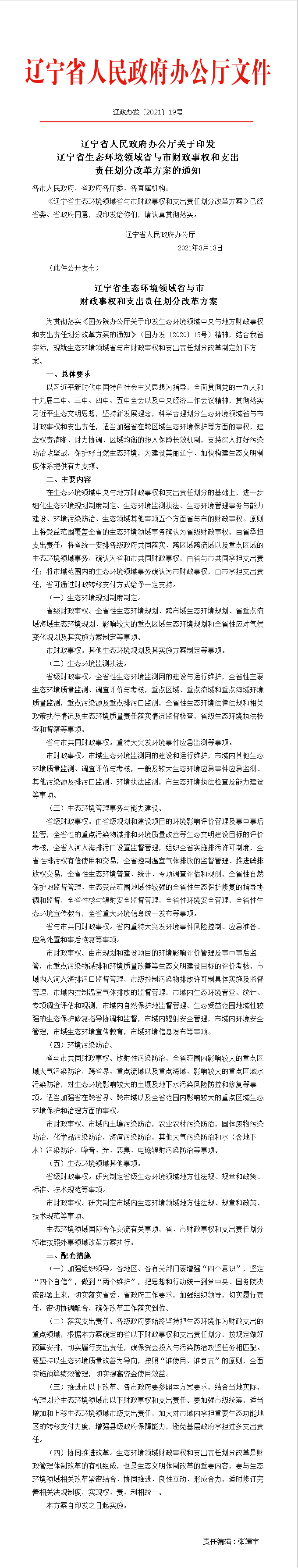 日前,辽宁省人民政府办公厅发布了《辽宁省人民政府办公厅关于印发辽宁省生态环境领域省与市财政事权和支出责任划分改革方案的通知》。详情如下: