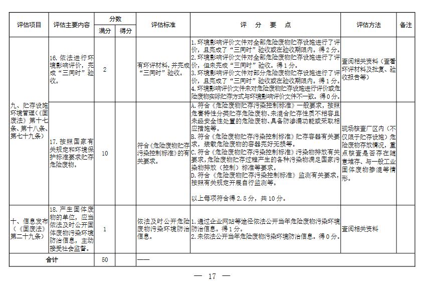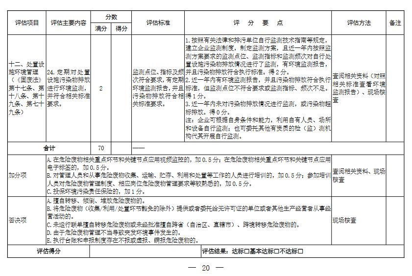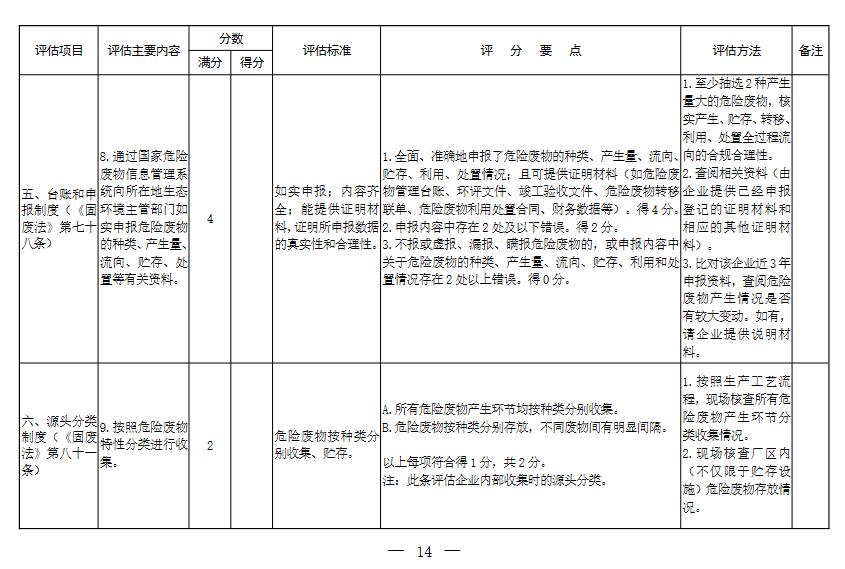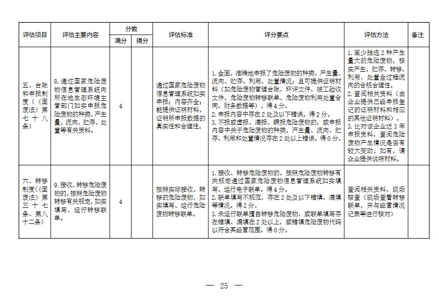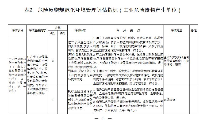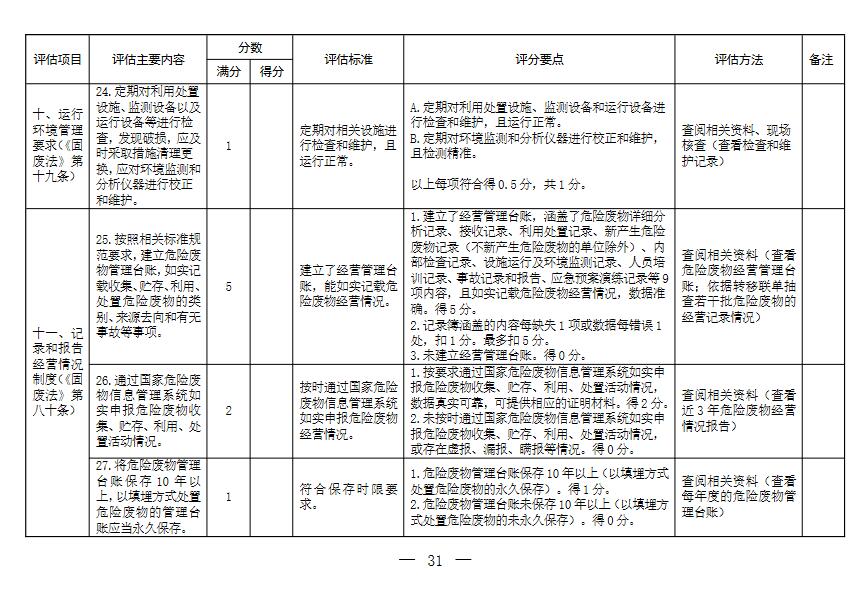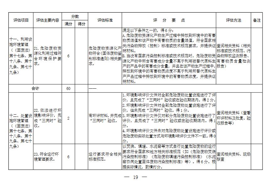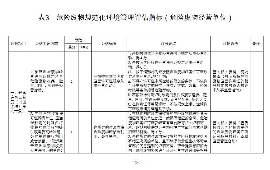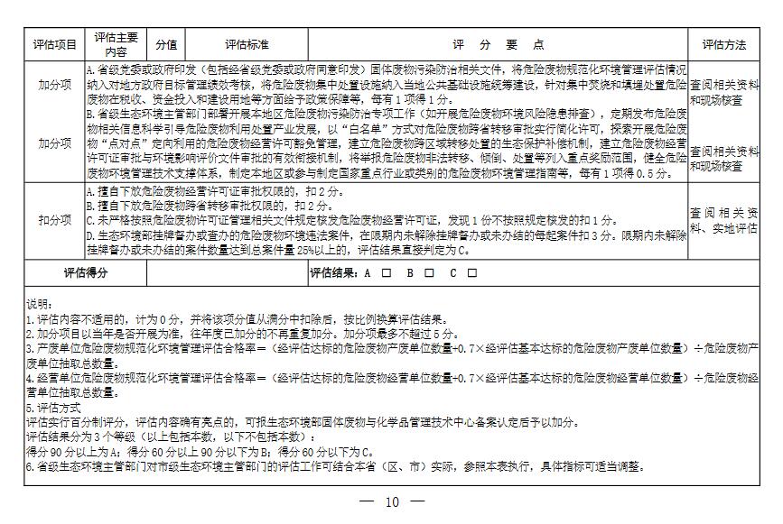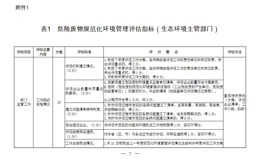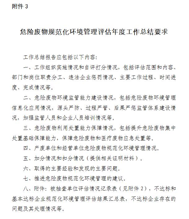 (三)评估安排。各省级生态环境主管部门应于每年1月31日前按照《评估指标》表1进行自评打分,总结上一年度危险废物规范化环境管理评估情况(要求见附件3),制定本年度评估工作方案,并将上述3项材料报送生态环境部,抄送生态环境部固体废物与化学品管理技术中心。