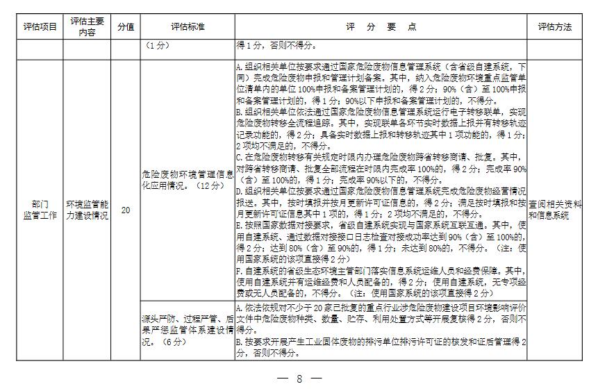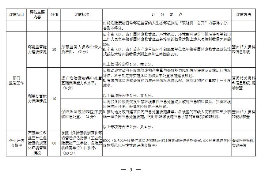 (二)推动政府和部门落实监管责任。合理设立评估指标,推动各地和相关部门落实危险废物监管和利用处置能力保障等工作的组织领导、方案编制、责任落实、能力建设、工作成效等事项。