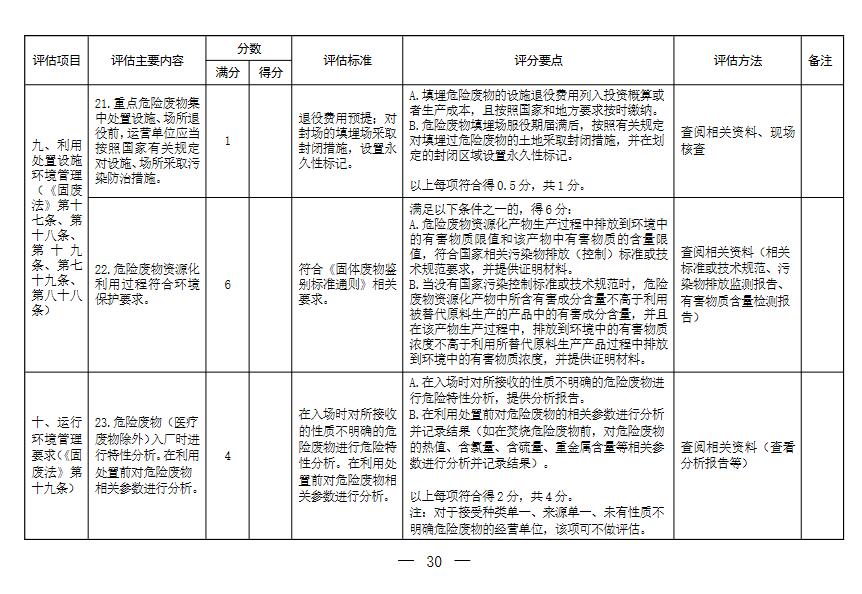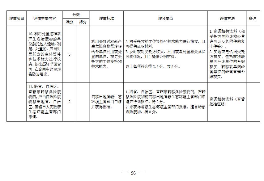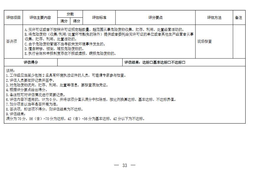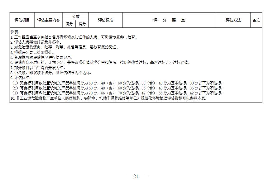(一)国家评估。生态环境部每年按照《危险废物规范化环境管理评估指标》(以下简称《评估指标》,见附件 1),结合统筹强化监督等,现场评估部分省(区、市)上年度危险废物规范化环境管理情况。