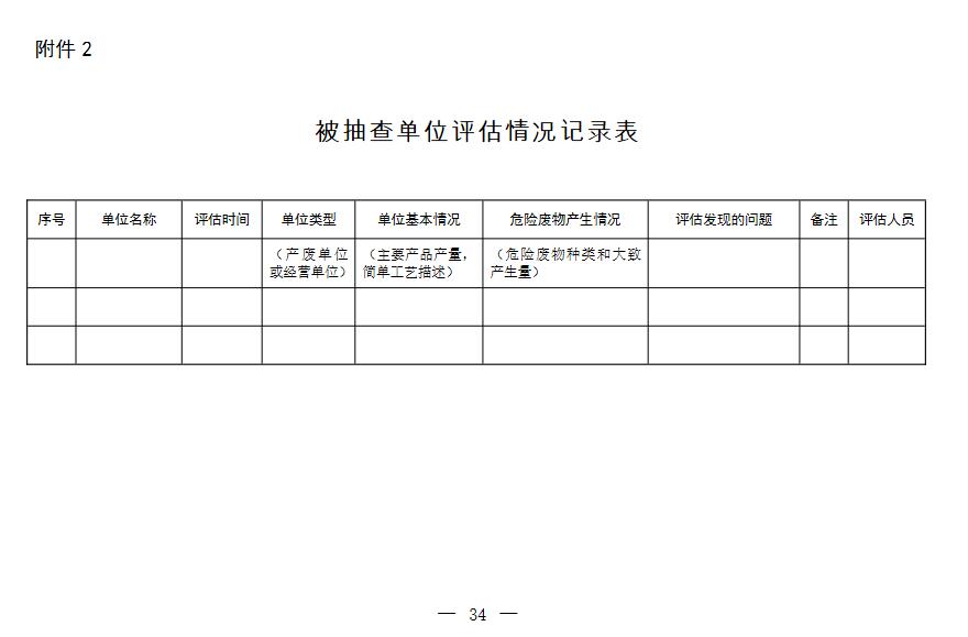 (二)地方评估。省级生态环境主管部门对市级生态环境主管部门的评估,可结合本省(区、市)实际,参照《评估指标》表1执行,具体指标可适当调整。各级地方生态环境主管部门按照《评估指标》表2和表3对产废单位和经营单位进行评估,并填写《被抽查单位评估情况记录表》(见附件2)。固体废物管理、环境执法、环境影响评价与排污许可等部门要对危险废物规范化环境管理评估工作做好必要的政策指导。有条件的地区,可以采取购买第三方服务等方式,为危险废物规范化环境管理评估工作提供技术支撑。