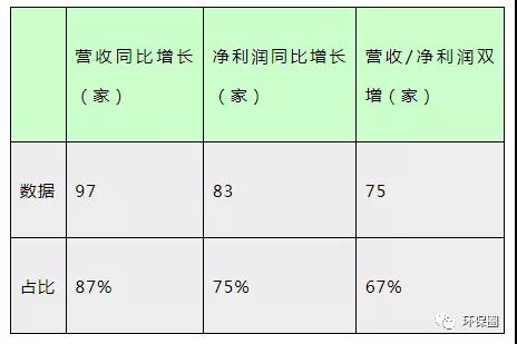 综合来看,111家上市环企中,营收同比增长的高达97家,占比87%;归母净利润同比增加则有83家,约占75%。各方面信号都显示,环保行业的“至暗时刻”已经过去,整个行业迎来强势复苏。