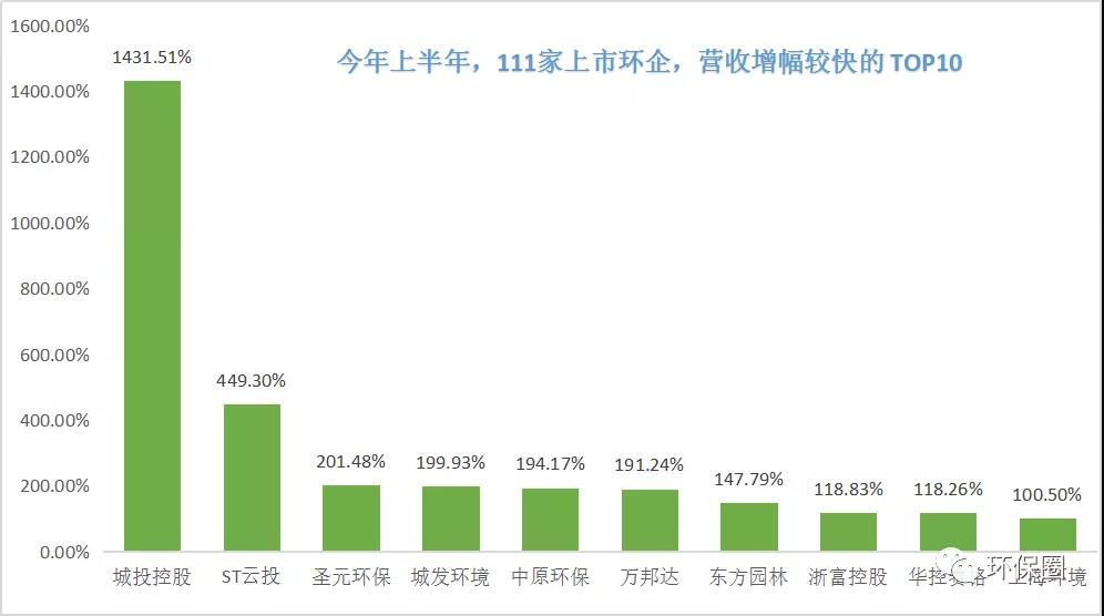 营收变动幅度方面,数据同样喜人。111家上市环企,除了那些稳步连续增长“卓越者”,每年总有一些让人意想不到的“黑马”企业率先突围出来,少则百分之几百增长,多则百分之上千增长,成为上半年营收增速最快的10家先锋企业。