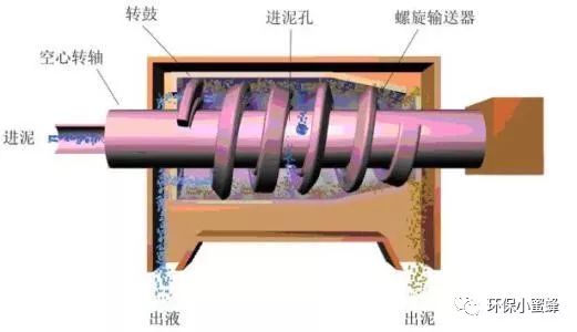 原理:由转载和带空心转轴的螺旋输送器组成,污泥由空心转轴送入转筒,在高速旋转产生的离心力下,立即被甩入转鼓腔内。由于比重不一样,形成固液分离。污泥在螺旋输送器的推动下,被输送到转鼓的锥端由出口连续排出;液环层的液体则由堰口连续“溢流”排至转鼓外靠重力排出。