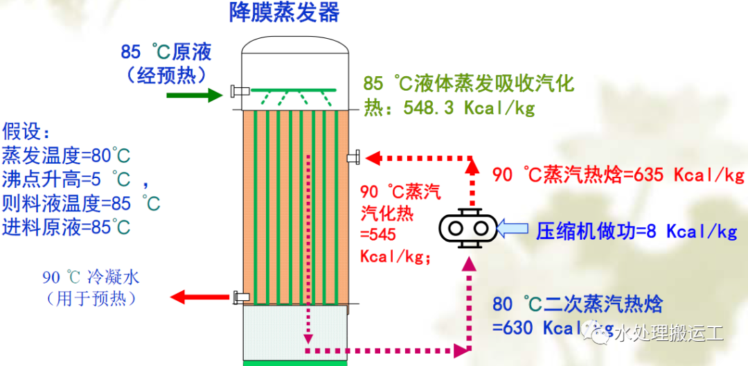 MVR技术节能的核心是将二次蒸汽的热焓通过提升其温度作为热源替代新鲜蒸汽,外加一部分压缩机做功从而实现循环蒸发!