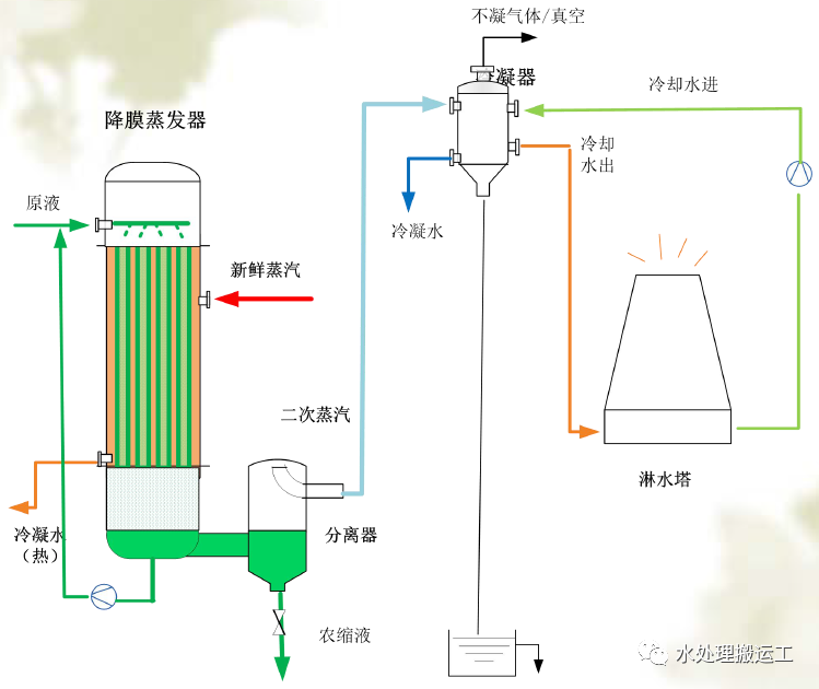 常规蒸发中需要大量冷却水冷却二次蒸汽的热量(使之冷凝) ,然后冷却水的热量再通过冷却塔
