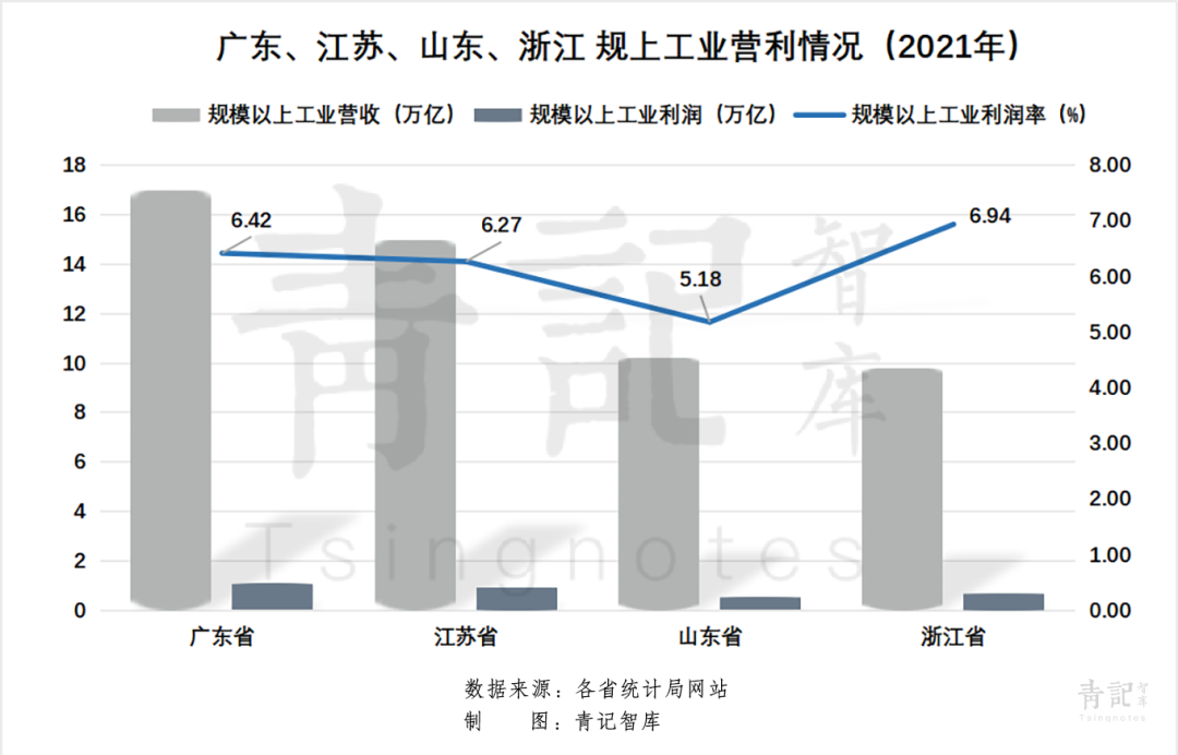 对比来看,山东2021年规上工业增速与全国持平,但落后于江苏和浙江,规上工业营收在四省中排名第三,但利润总额和利润率均排名垫底,且规上工业利润率与其他三省差距较大。