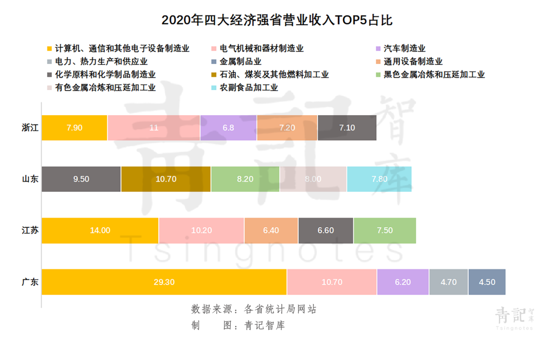 具体来看,在广东、江苏和浙江工业结构中,占比最高的产业都是“计算机、通信和其他电子设备制造业”,分别占29.3%、14%、7.9%。