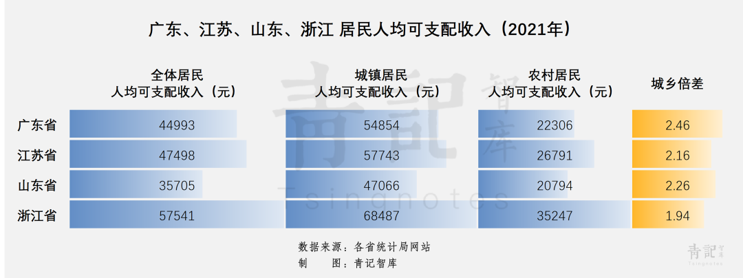 从全体居民人均可支配收入来看,广东44993元,江苏47498元,山东35705元,浙江57541元。
