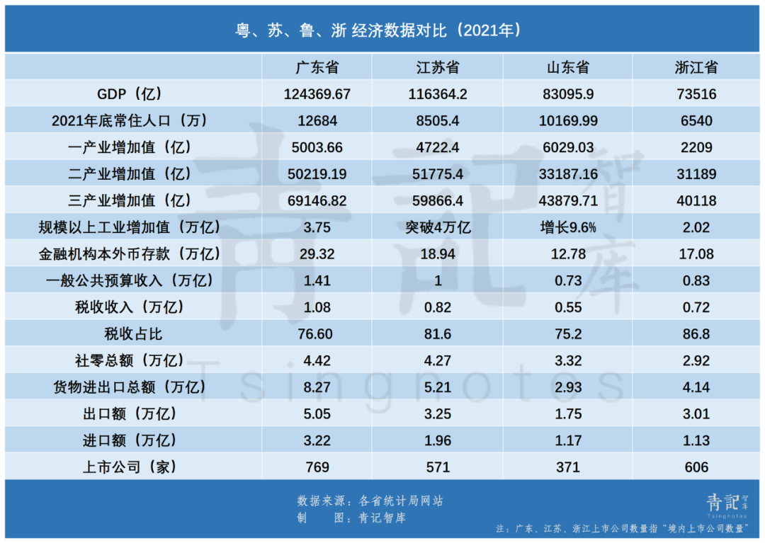 2021年,全国GDP四强广东、江苏、山东、浙江均迎来新突破: