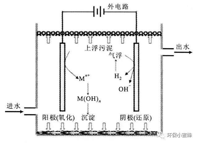 以金属为溶解性阳极(一般为铝或铁),在电解时产生的Al3+或Fe3+离子生成电活性絮凝剂,来压缩胶体双电层使其脱稳,以及吸附架桥网捕作用来实现的: