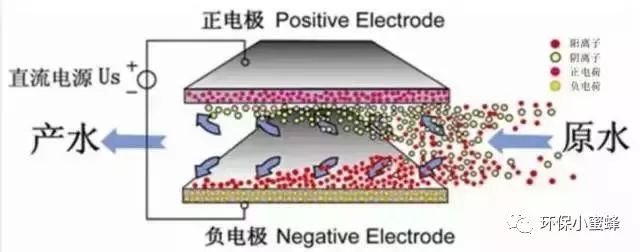 原水从一端进入由两电极板相隔而成的空间,从另一端流出。原水在阴、阳极之间流动时受电场的作用,水中离子分别向带相反电荷的电极迁移,被该电极吸附并储存在双电层内。随着电极吸附离子的增多,离子在电极表面富集浓缩,最终实现盐分与水的分离,获得淡化的水。