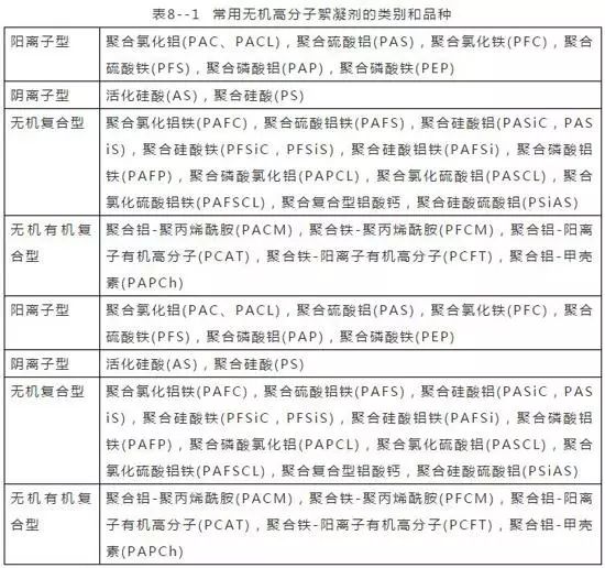 无机絮凝剂包括铝盐、铁盐及其聚合物。有机絮凝剂按照聚合单体带电集团的电荷性质,可分为阴离子型、阳离子型、非离子型、两性型等几种,按其来源又可分为人工合成和天然高分子絮凝剂两大类。在实际应用中,往往根据无机絮凝剂和有机絮凝剂性质的不同,把它们加以复合,制成无机有机复合型絮凝剂。微生物絮凝剂则是现代生物学与水处理技术相结合的产物,是当前絮凝剂研究发展和应用的一个重要方向。