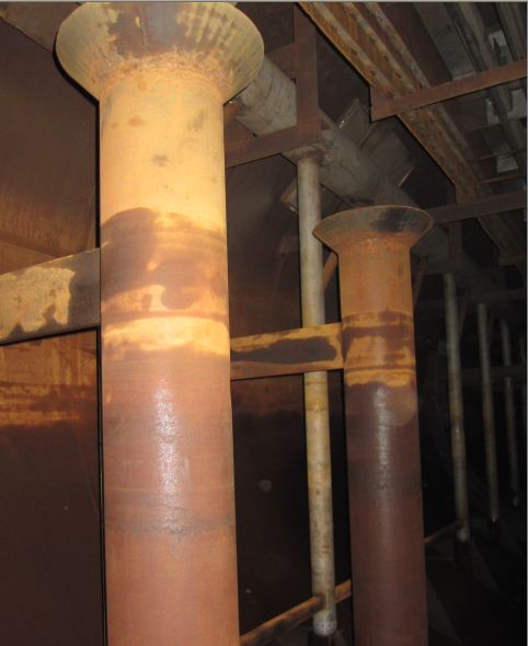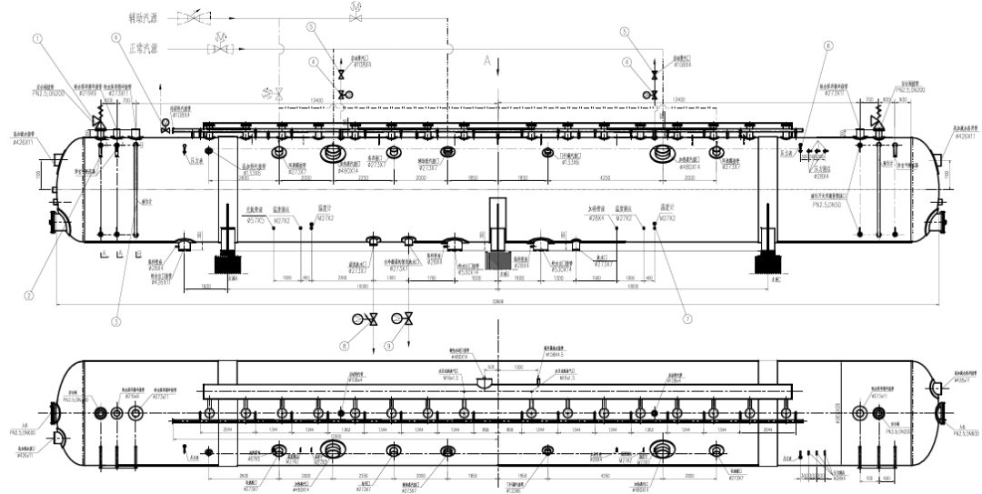 除氧器设有两个对外连接的再沸腾接管,再沸腾装置是由两根Φ273×7的进口管和Φ273×7的布汽母管及均匀分布的18个支管组成。蒸汽通过在每一个支管上的12个Φ10的小孔喷出,水被均匀地加热,此种结构可以减小振动和噪音。