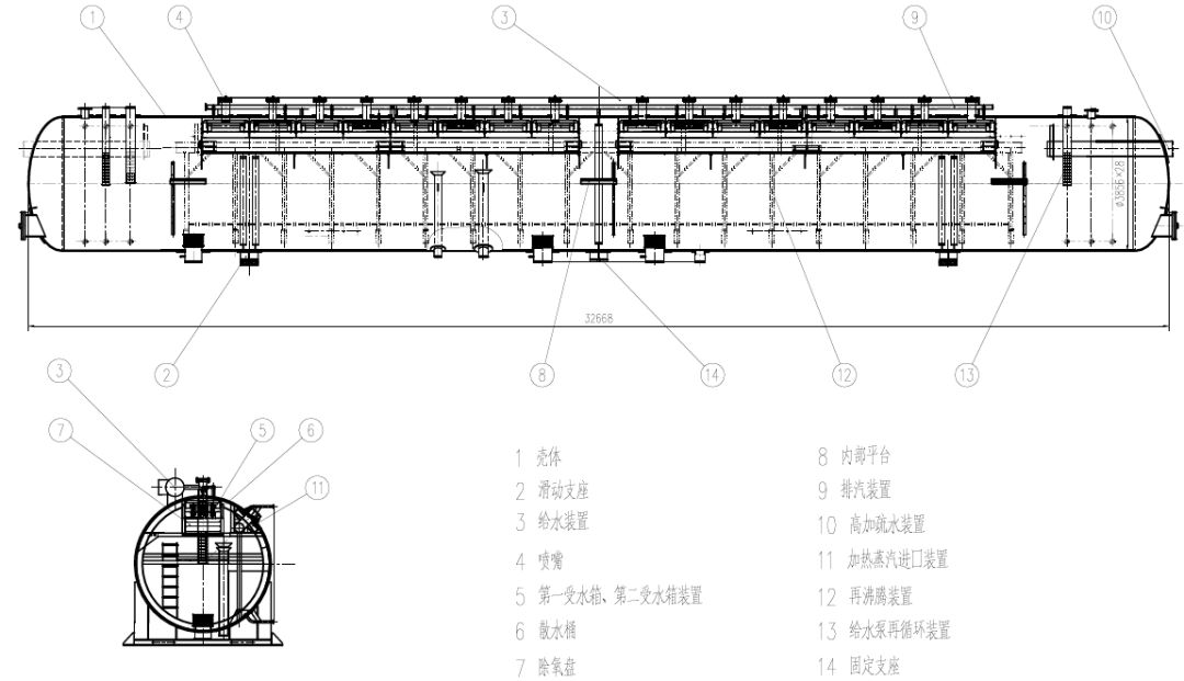 SSD-2010/235单筒式除氧器结构见下图,除氧器主要部件有壳体、支座、进水装置、弹簧喷嘴、受水箱装置、散水桶装置、除氧盘、内部平台、排汽装置、加热蒸汽装置、高加疏水装置、再循环管及再沸腾装置等。
