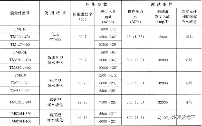 目前,各生产厂家均有多种不同类型的膜元件,根据进水类型、脱盐率、操作压力、设计能力等要求,从中可以选择合适的膜元件。
