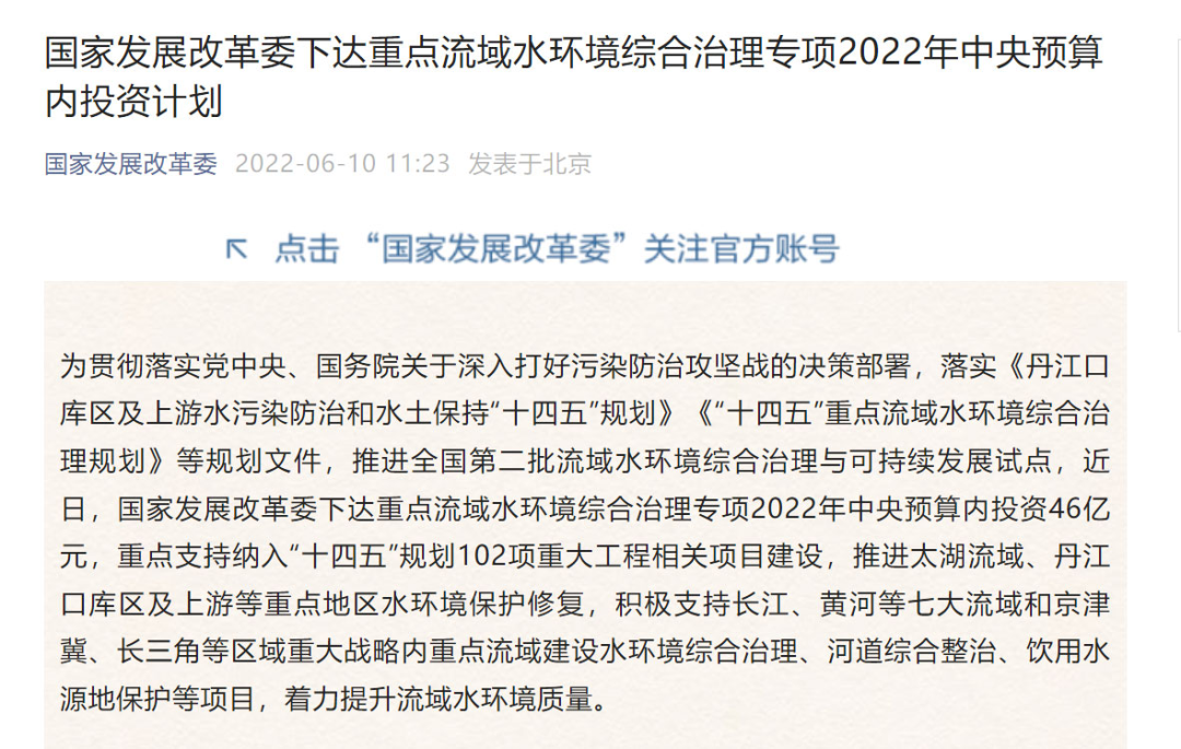 6月10日,国家发展改革委下达重点流域水环境综合治理专项2022年中央预算内投资46亿元,重点支持纳入“十四五”规划102项重大工程相关项目建设,推进太湖流域、丹江口库区及上游等重点地区水环境保护修复,积极支持长江、黄河等七大流域和京津冀、长三角等区域重大战略内重点流域建设水环境综合治理、河道综合整治、饮用水源地保护等项目,着力提升流域水环境质量。