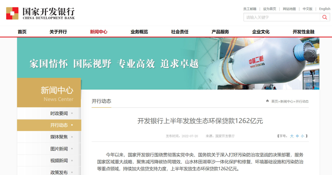 7月20日,国家开发银行官网发文表示,今年以来,国家开发银行围绕贯彻落实党中央、国务院关于深入打好污染防治攻坚战的决策部署,服务国家区域重大战略,聚焦减污降碳协同增效、山水林田湖草沙一体化保护和修复、环境基础设施和污染防治等重点领域,持续加大信贷支持力度,上半年已经发放生态环保贷款1262亿元。