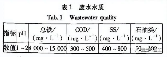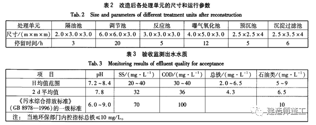 改造后的处理工艺增加了隔油池和曝气氧化系统,还引进了板框压滤机。改造后工艺的主要特点:①废水进调节池前先进行隔油处理,提高了后续工艺的处理效率,出水的石油类指标可以达到排放标准。②向反应池中投加贝壳粉(主要成分为碳酸钙),就地取材,降低了用药成本,提高了反应效率。在反应池中增加曝气氧化系统,将亚铁转化成三价铁沉淀而去除。当废水pH值为5.5时,Fe(OH),的溶解度最小;当pH值上升到12时,Fe(OH),重新溶解;当pH值为7.0~7.5时进行曝气,亚铁可迅速转化成三价铁,形成氢氧化铁沉渣而去除。③不溶性的铁氧化物以一种稳定的胶体分散形态悬浮在水中。由于胶体颗粒非常小,因而可阻止沉淀发生。此外,由于这些颗粒带有特殊的表面电荷,会引起相互排斥,因此难以凝聚成大颗粒。新生成的Fe(OH),具有密度小的特点,若停留时间短或缺少附加处理设施,则沉降困难。再者,由于废水浓度非常高,泥渣浓稠,常规沉淀池进行固液分离困难。因此,在预沉池后引进板框压滤机,预沉池的上清液直接进入斜管沉淀池,下层泥渣较浓部分则通过板框压滤机压滤后进入砂滤池,这样就保证了固液分离效果,提高了废水处理效率。改造后处理单元的尺寸和运行参数见表2。连续运行3个月后,当地环保部门进行了水样监测和工程验收,监测结果见表3。