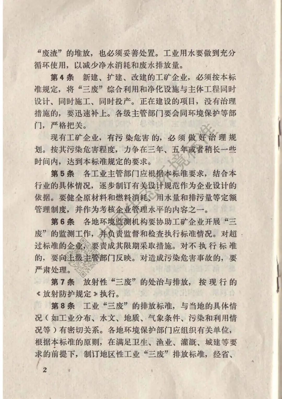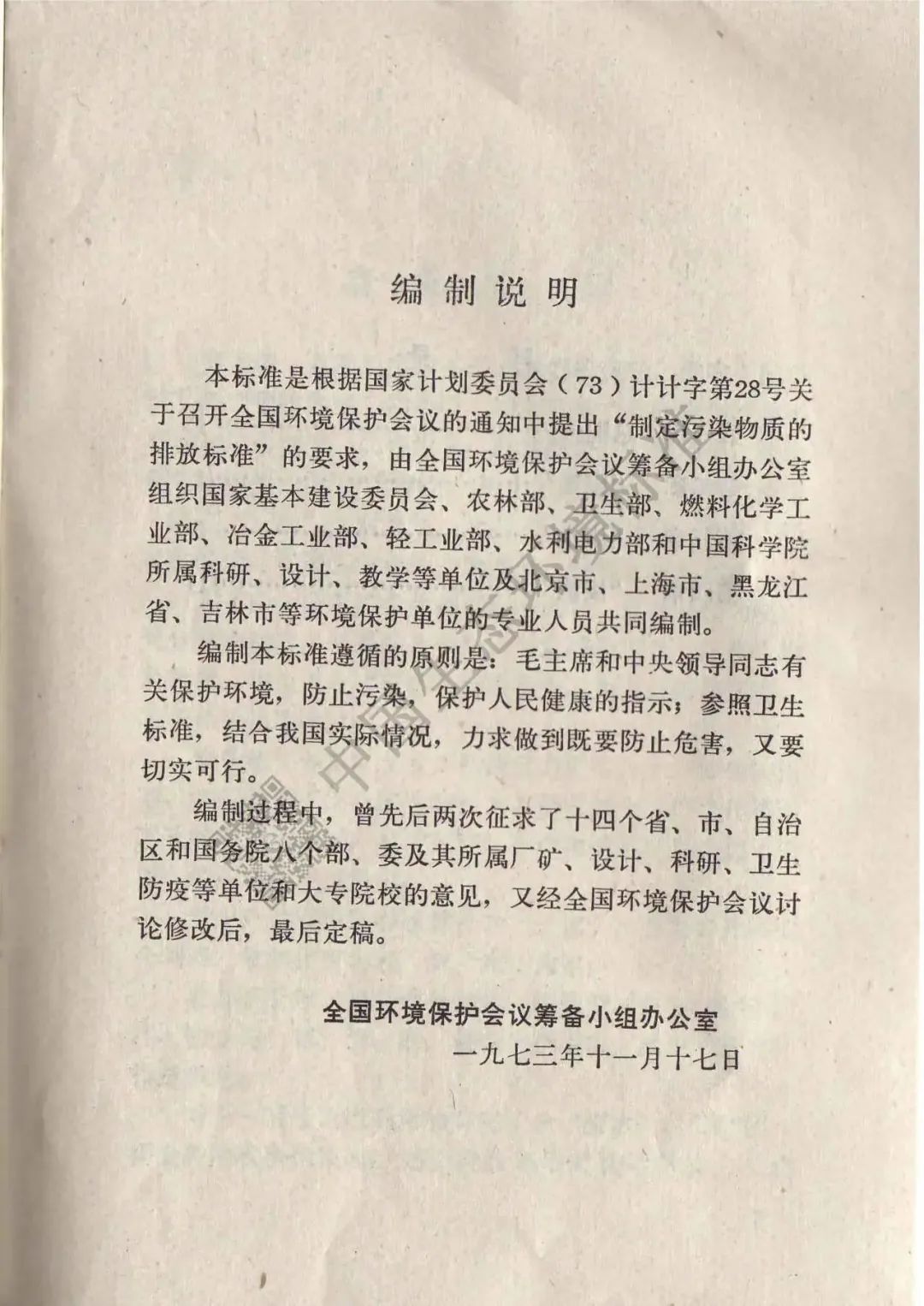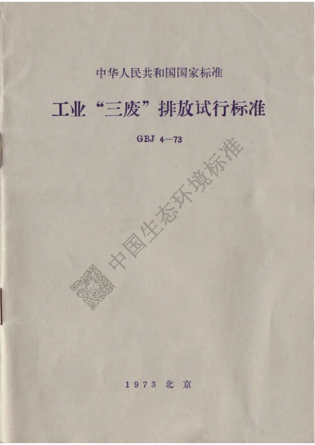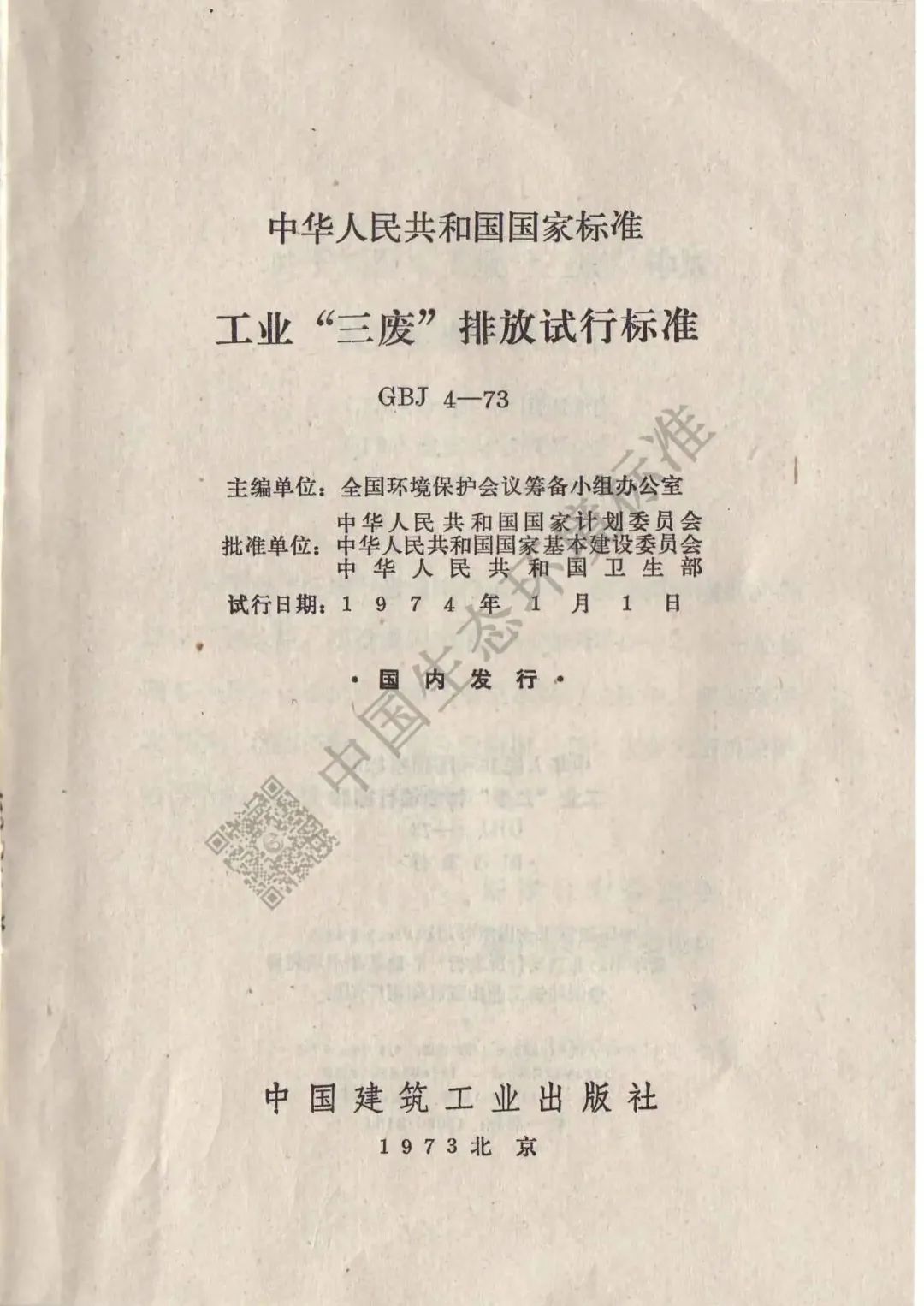 我国的环境标准化工作是与环境保护事业同步发展起来的。1973年8月召开的第一次全国环境保护工作会议为我国环境保护事业的发展奠定了基础。与此同时,我国的第一个环境标准《工业“三废”排放试行标准》也完成了编制工作,提交此次会议讨论通过。其后,由原国家建委、国家计委和卫生部联合发布。《工业“三废”排放试行标准》对我国环境保护事业的发展具有重要的历史意义,它为环境保护部门行使管理职能提供了依据,在“三同时”(在进行新建、改建和扩建工程时,其防止污染和其他公害的设施,必须与主体工程同时设计、同时施工、同时投产)把关、排污收费、环境影响评价、污染防治等工作中发挥了积极的作用。具体编制历程如下:1973年1月8日,在全国环境保护会议筹备领导小组办公室中,设立排放标准组,研究制订污染物排放标准。1973年1月31日,筹各办公室请清华大学钱伟长教授作访问美国等四国环境污染及环境标准管理的报告。1973年2月12日,成立“三废”排放标准编制小组。1973年6月,完成“三废”排放标准(征求意见稿),先后两次征求14个省、市、自治区和中央8个部委所属重点厂矿、科研、设计单位、大专院校的意见。并连同《放射防护规定》一同提交全国环境保护工作会议讨论。1973年8月5~20日,在北京召开第一次全国环境保护工作会议。会议通过了《工业“三废”排放试行标准》和《放射性防护规定》。国务院批转了《关于保护和改善环境的若干规定》,该《规定》指出:“对于目前还不能综合利用的‘三废’尽可能实行净化处理…使排出物不超过国家颁布的排放标准。” 1973年11月17日,国家计委、国家建委、卫生部联合发布我国第一个环境保护标准GBJ4一73《工业“三废”排放试行标准》,自1974年1月1日起试行。标准规定了19项水污染物排放标准和13项大气污染物排放标准及对废渣的管理要求,并提出“三同时”原则,规定各省、自治区、直辖市可根据本地具体情况制定地方排放标准。主要技术内容标准规定了废气中二氧化硫、二硫化碳、硫化氢、氟化物、氮氧化物、氯、氯化氢、一氧化碳、硫酸雾、铅、汞、铍化物、烟尘及生产性粉尘13种有害物质的排气筒高度、排放量、排放浓度指标,适用于电站、冶金、化工、轻工、工业及采暖锅炉、炼钢电炉、炼钢转炉、水泥等企业。标准对废水排放区分第一类有害物质和第二类有害物质规定了不同的排放控制要求。第一类有害物质,是指能在环境或动植物体内蓄积,对人体健康产生长远影响的有害物质,标准规定了废水中汞及其化合物、镉及其化合物、六价铬化合物、砷及其化合物、铅及其化合物 5 种第一类有害物质的最高容许排放浓度指标,并要求在车间或车间处理设备排出口满足指标要求。第二类有害物质是指其长远影响小于第一类的有害物质,标准规定了废水中pH值、悬浮物、生化需氧量、化学耗氧量、硫化物、挥发性酚、氰化物、有机磷、石油类、铜及其化合物、锌及其化合物、氟的无机化合物、硝基苯类、苯胺类14种第二类有害物质的最高容许排放浓度指标,并要求在工厂排出口满足指标要求。标准规定凡已有综合利用经验的“废渣”,必须列入综合利用项目;“废渣”堆放场所,要尽量少占农田,不占良田;要有防止扬散、流失措施,以防止对大气、水源和土壤的污染;含汞、镉、砷、六价铬、铅、氰化物、黄磷及其它可溶性剧毒“废渣”,必须有专设的具有防水、防渗措施的存放场所,并禁止埋入地下与排入地面水体。