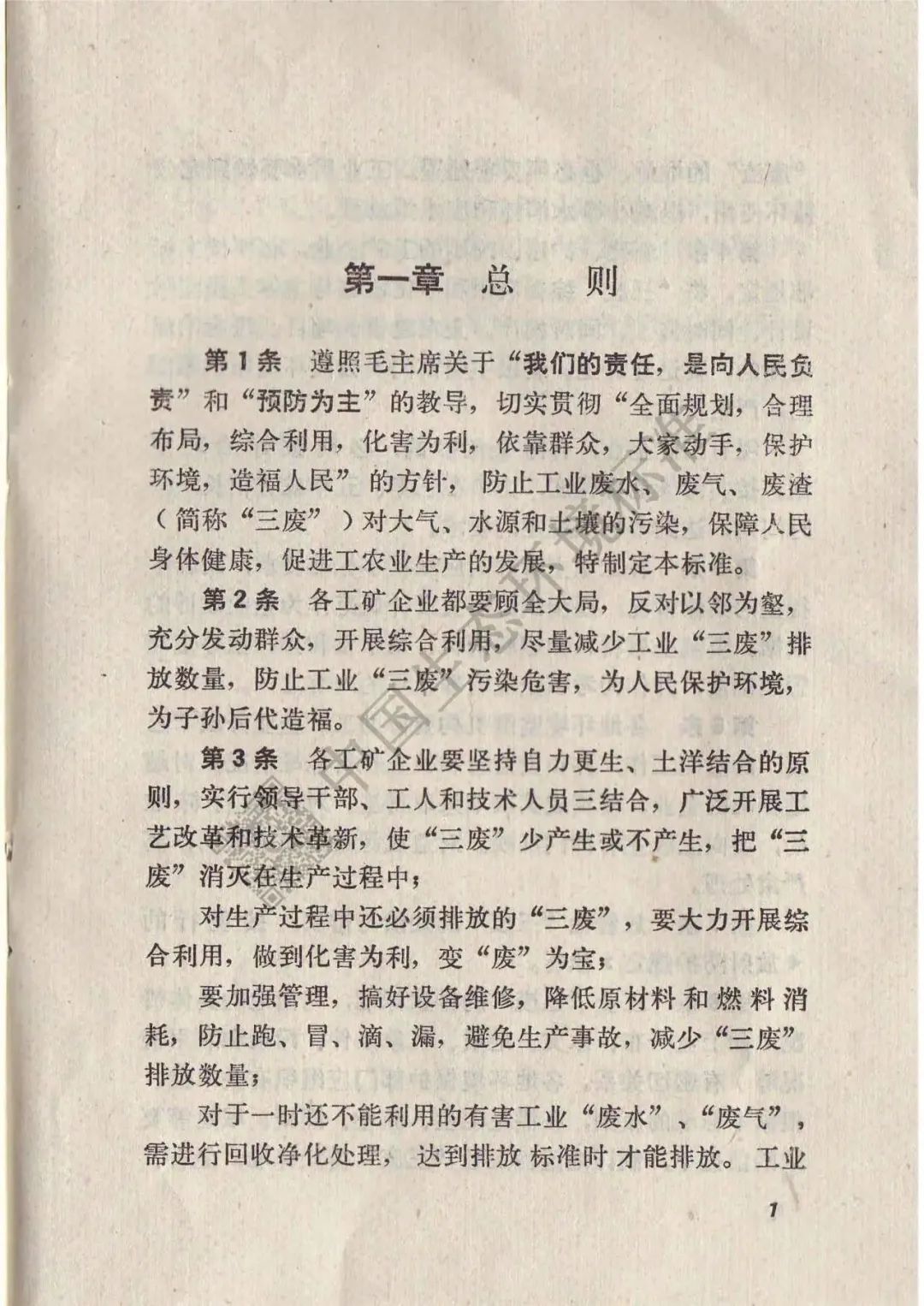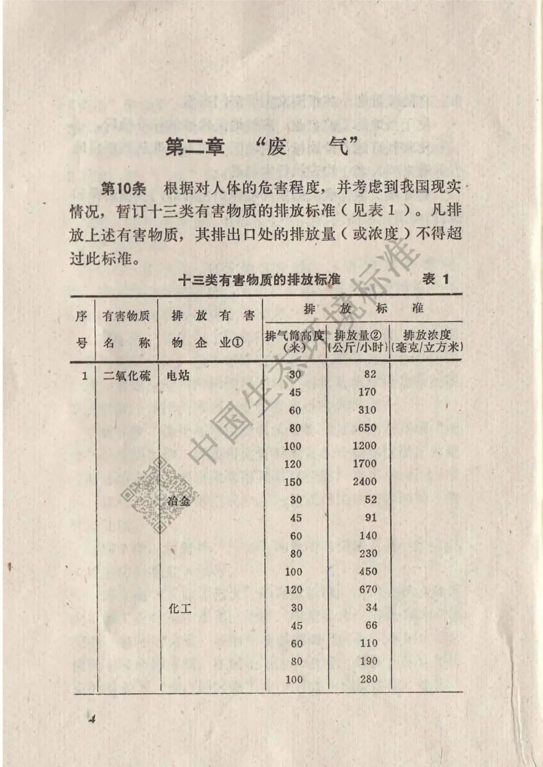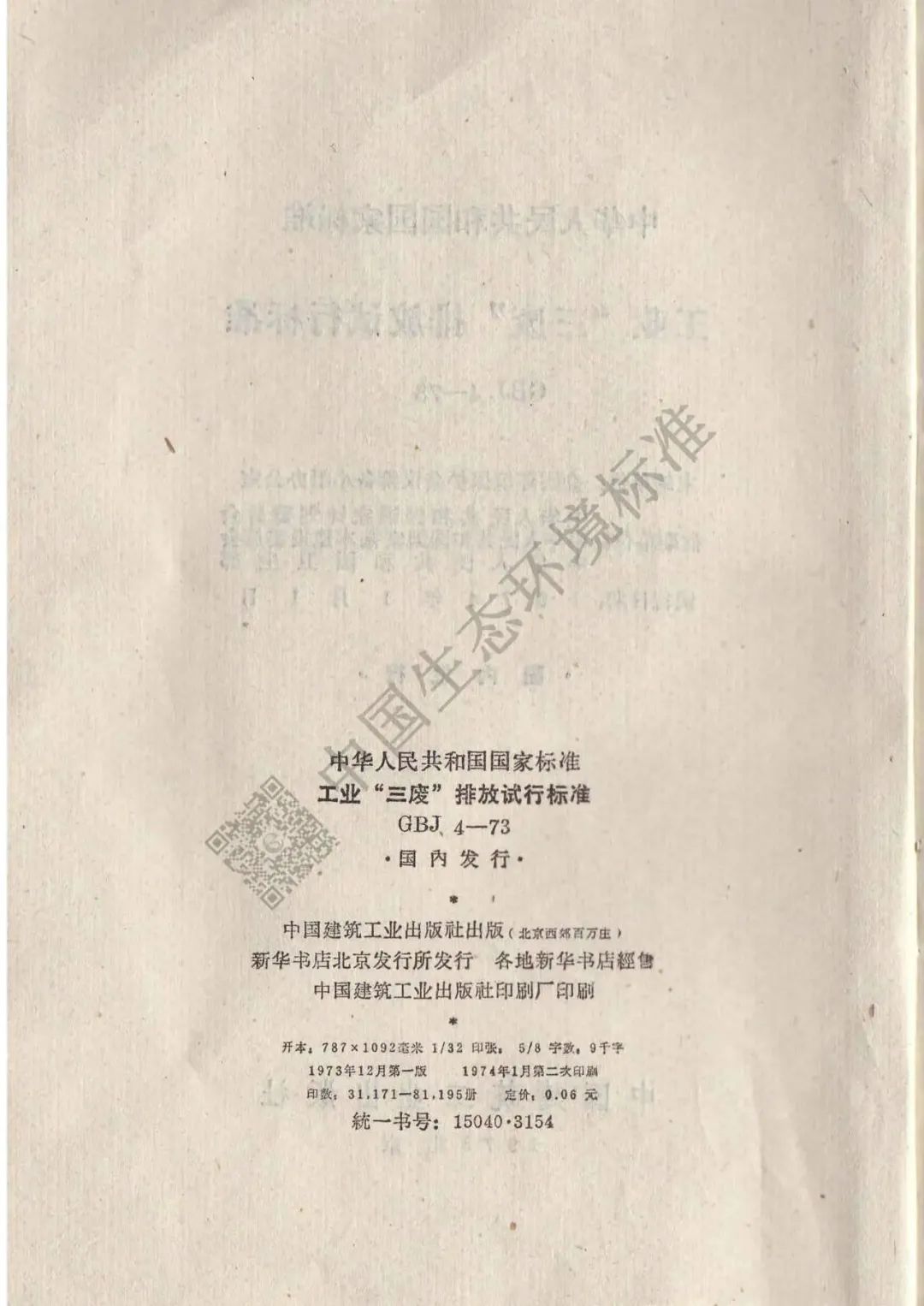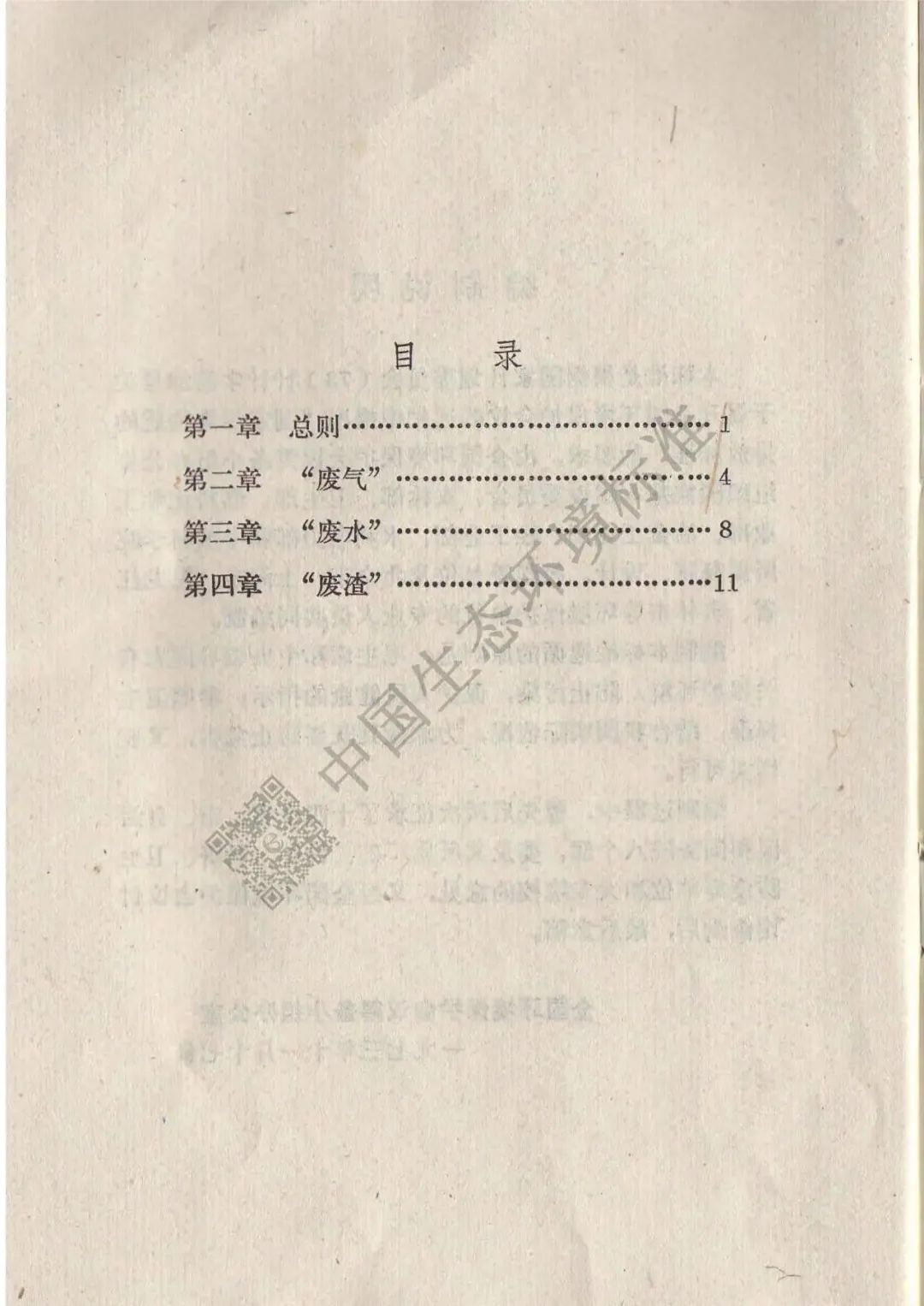 我国的环境标准化工作是与环境保护事业同步发展起来的。1973年8月召开的第一次全国环境保护工作会议为我国环境保护事业的发展奠定了基础。与此同时,我国的第一个环境标准《工业“三废”排放试行标准》也完成了编制工作,提交此次会议讨论通过。其后,由原国家建委、国家计委和卫生部联合发布。《工业“三废”排放试行标准》对我国环境保护事业的发展具有重要的历史意义,它为环境保护部门行使管理职能提供了依据,在“三同时”(在进行新建、改建和扩建工程时,其防止污染和其他公害的设施,必须与主体工程同时设计、同时施工、同时投产)把关、排污收费、环境影响评价、污染防治等工作中发挥了积极的作用。具体编制历程如下:1973年1月8日,在全国环境保护会议筹备领导小组办公室中,设立排放标准组,研究制订污染物排放标准。1973年1月31日,筹各办公室请清华大学钱伟长教授作访问美国等四国环境污染及环境标准管理的报告。1973年2月12日,成立“三废”排放标准编制小组。1973年6月,完成“三废”排放标准(征求意见稿),先后两次征求14个省、市、自治区和中央8个部委所属重点厂矿、科研、设计单位、大专院校的意见。并连同《放射防护规定》一同提交全国环境保护工作会议讨论。1973年8月5~20日,在北京召开第一次全国环境保护工作会议。会议通过了《工业“三废”排放试行标准》和《放射性防护规定》。国务院批转了《关于保护和改善环境的若干规定》,该《规定》指出:“对于目前还不能综合利用的‘三废’尽可能实行净化处理…使排出物不超过国家颁布的排放标准。” 1973年11月17日,国家计委、国家建委、卫生部联合发布我国第一个环境保护标准GBJ4一73《工业“三废”排放试行标准》,自1974年1月1日起试行。标准规定了19项水污染物排放标准和13项大气污染物排放标准及对废渣的管理要求,并提出“三同时”原则,规定各省、自治区、直辖市可根据本地具体情况制定地方排放标准。主要技术内容标准规定了废气中二氧化硫、二硫化碳、硫化氢、氟化物、氮氧化物、氯、氯化氢、一氧化碳、硫酸雾、铅、汞、铍化物、烟尘及生产性粉尘13种有害物质的排气筒高度、排放量、排放浓度指标,适用于电站、冶金、化工、轻工、工业及采暖锅炉、炼钢电炉、炼钢转炉、水泥等企业。标准对废水排放区分第一类有害物质和第二类有害物质规定了不同的排放控制要求。第一类有害物质,是指能在环境或动植物体内蓄积,对人体健康产生长远影响的有害物质,标准规定了废水中汞及其化合物、镉及其化合物、六价铬化合物、砷及其化合物、铅及其化合物 5 种第一类有害物质的最高容许排放浓度指标,并要求在车间或车间处理设备排出口满足指标要求。第二类有害物质是指其长远影响小于第一类的有害物质,标准规定了废水中pH值、悬浮物、生化需氧量、化学耗氧量、硫化物、挥发性酚、氰化物、有机磷、石油类、铜及其化合物、锌及其化合物、氟的无机化合物、硝基苯类、苯胺类14种第二类有害物质的最高容许排放浓度指标,并要求在工厂排出口满足指标要求。标准规定凡已有综合利用经验的“废渣”,必须列入综合利用项目;“废渣”堆放场所,要尽量少占农田,不占良田;要有防止扬散、流失措施,以防止对大气、水源和土壤的污染;含汞、镉、砷、六价铬、铅、氰化物、黄磷及其它可溶性剧毒“废渣”,必须有专设的具有防水、防渗措施的存放场所,并禁止埋入地下与排入地面水体。