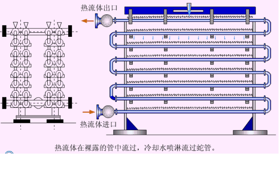 间壁式换热器是目前应用最为广泛的换热器,先就间壁式换热器的种类、结构、优缺点总结如下。间壁式换热器种类、结构及优缺点(一)管式换热器1.蛇管式换热器(1)沉浸式蛇管换热器:如图1结构:这种换热器多以金属管子绕成,或制成各种与容器相适应的情况,并沉浸在容器内的液体中。优点:结构简单,便于防腐,能承受高压。缺点:由于容器体积比管子的体积大得多,因此管外流体的表面传热系数较小;不便于管内清洗。(2)喷淋式换热器:如图2结构:喷淋式换热器这种换热器是将换热管成排地固定在钢架上,热流体在管内流动,冷却水从上方喷淋装置均匀淋下。优点:便于检修和清洗、传热效果也较好。缺点:喷淋不易均匀。