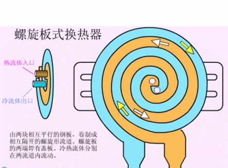 板式换热器与管壳式比传热效率更高,占地少,重量轻,更便宜,但是板式管热器受到温度和压力的限制,同时对于含有颗粒的介质也不适用于板式换热器,容易堵塞流道。其传热系数一般在3000~5000W/㎡*℃。(五)螺旋板式换热器: